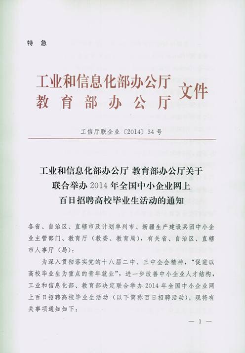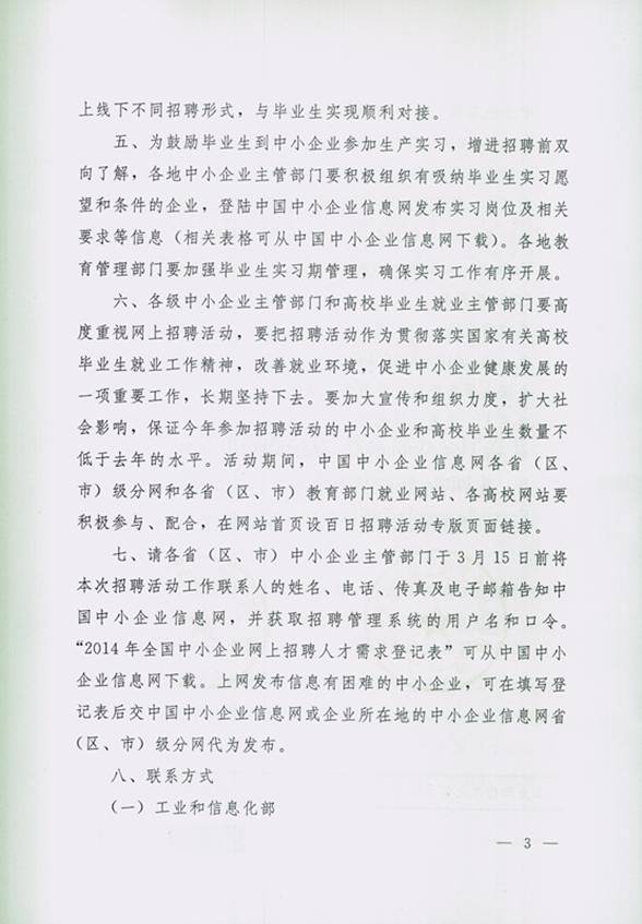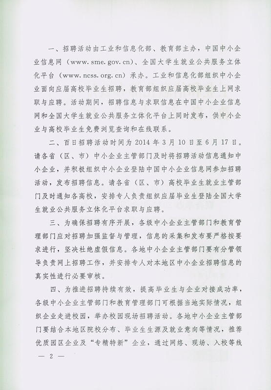 五、关于举办2014年全国中小企业网上百日招聘高校毕业生活动的通知