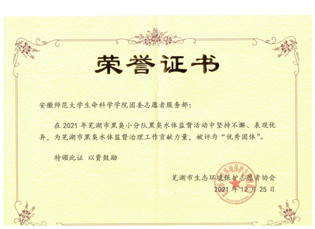 生科院团委志愿者服务部荣获2021年芜湖市黑臭水体调研保护“优秀团体”称号