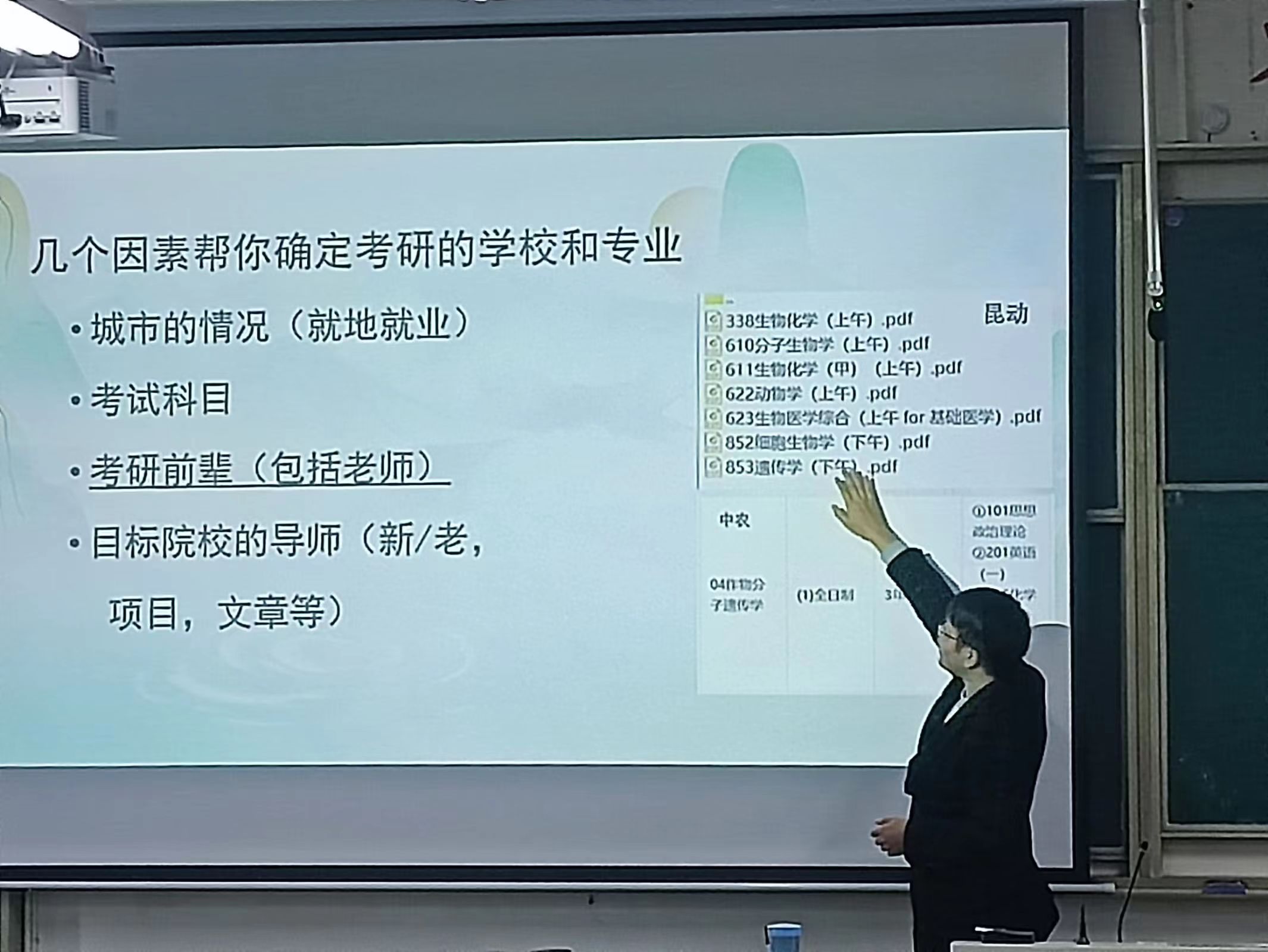 姜斌强调同学们要把握好人生道路的关键时刻,尽早确定人生大方向。他强调,立志科研、学历提升、直接工作等选择都要以兴趣为主,密切联系自身情况。姜斌围绕公司考研趋势、考研方向、考研院校选择等考研关键词与同学们分享了自己的想法。结合生科院往届毕业生的就业去向,为同学们分析了当前就业趋势和就业选择,明确了就业该做的准备,拓宽了同学们对本专业就业领域的认识。姜斌鼓励同学们围绕国家需求,将自身发展融入到国家发展中,坚持提升自己,立志做有利于社会的人才。