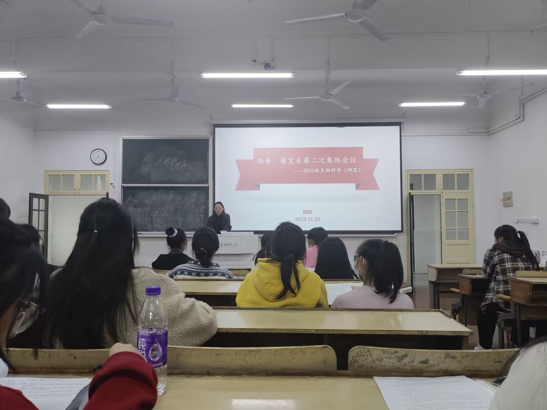 11月22日下午,2023级生物科学专业于教学楼1401教室召开班委、寝室长第二次集体会议。2023级生物科学专业全体班委、寝室长参会,会议由辅导员胡玮主讲。