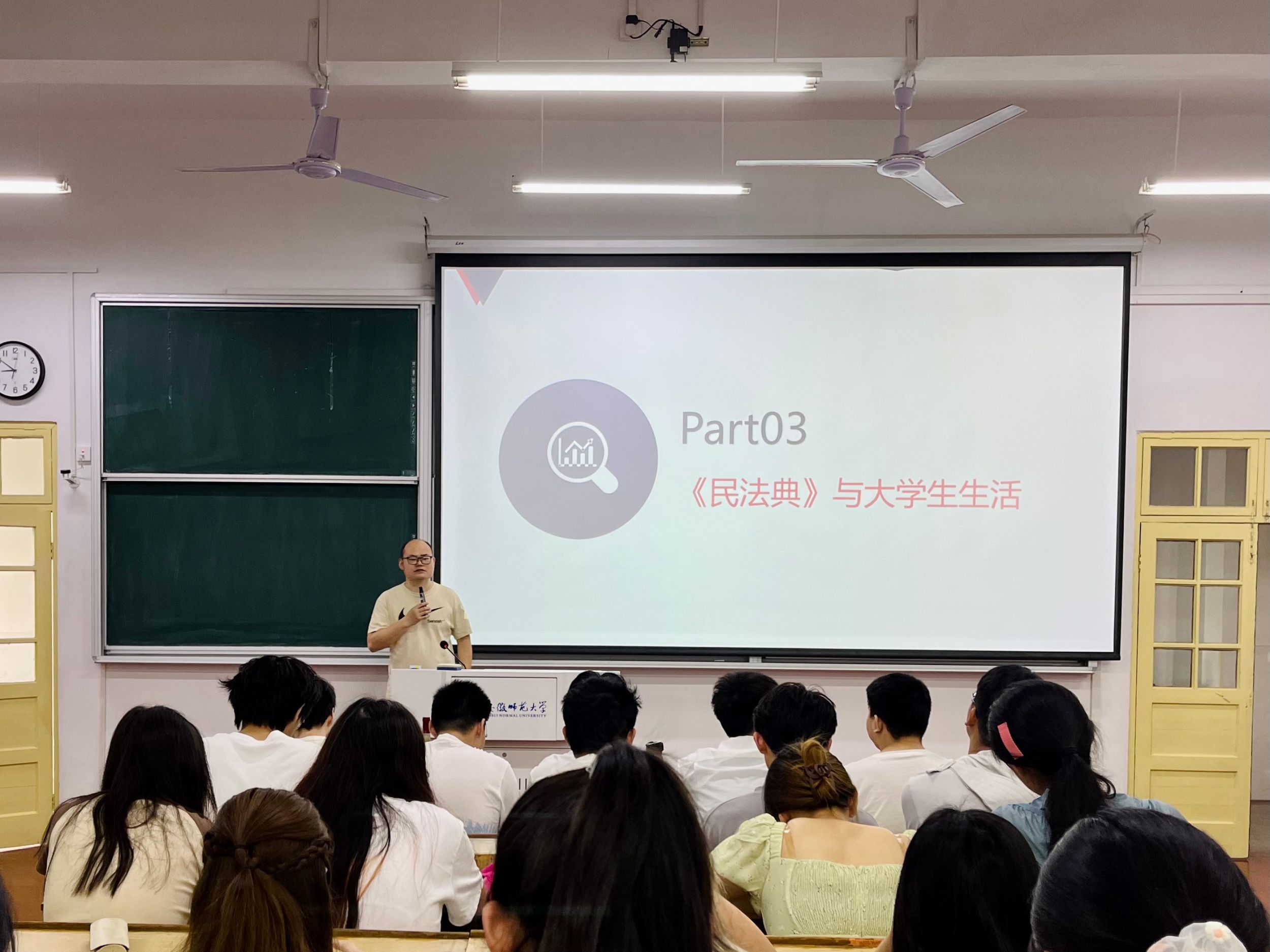 会上,何馗馗着重讲解了民法要义和基本原则,结合相关案例,期望同学们提升法治思维,强化规则意识、守约精神;遵从公序良俗,践行“行为世范”理念;维护自身权益,以法律为武器切实保障自身合法权益。