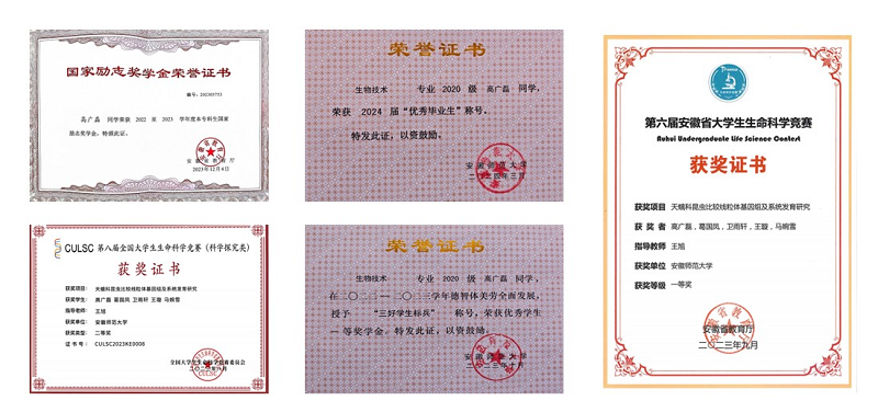在校期间他连续三年获得国家励志奖学金,获得校一等奖学金1次、校二等奖学金3次、雅酶生物医药奖学金1次。作为参赛主力队员,获得第六届安徽省老员工生命科学竞赛一等奖、第八届全国老员工生命科学竞赛(科学探究类)二等奖。现已推免至合肥工业大学食品与生物工程公司。