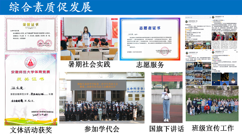 除了重视专业学习外,她也注重综合素质的发展。思想政治上,她不断加强对党的基本知识的学习,不断向党组织靠拢,目前是一名光荣的中共预备党员。工作中,她认真负责,兢兢业业,曾担任院团委员工会宣传部部员,在公司官网发布新闻稿3篇,生科院官网发布新闻稿9篇。在班级中她连续三年担任宣传委员,辅助团支书开展团日活动20余次,攥写班级活动的宣传稿20余篇,参与组织团建活动1次。文体活动上,她积极参与各类活动,连续两年代表公司参加校羽毛球比赛并获得女子团体第7名,带领院辩论队拿到“青春思辨”比赛校级“团体优秀奖”第四届化材公司“青锋杯”三等奖。社会实践中,她积极参加“三下乡”暑期社会实践活动,她所在的实践团队被评为校级重点团队,也在评比中获得院级二等奖。汪文岚同学攥写的活动新闻稿“存一抹温暖,激一泓清水”发布于中央级媒体“中国青年报”上。她担任了2021年迎新生志愿者,引导新生报道;担任2023年第六届安徽省生命科学竞赛(科学探究类)决赛志愿者,负责比赛计时、维持秩序等工作。