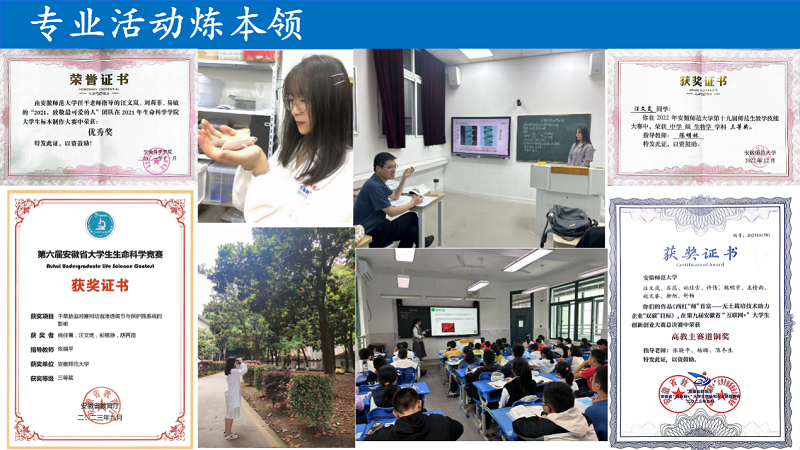 她作为第一负责人主持了一项题为“干旱胁迫对喜树幼苗生长、生理特征的影响”的省级大创,项目编号为S202210370266,现已顺利结项。在此项目基础上,她还作为第二负责人参与了第六届安徽省老员工生命科学竞赛(科学探究类),项目“干旱胁迫对喜树幼苗渗透调节与保护酶系统的影响”获得省级三等奖,团队编号为81357。她还作为团队负责人主持项目“西红‘师’首富——无土栽培助力企业‘双碳’目标”获得第九届中国国际“互联网+”老员工创新创业大赛高教主赛道省级铜奖,证书编号为2023101781。除了以上项目外,她还依据专业要求积极参加了其他比赛活动:在全国师范生教学技能大赛获得校级三等奖;在“三字”书法艺术比赛中获得院级二等奖;积极参与老员工讲思政课比赛、生物学名听写大赛、生物标本制作大赛、“未来老师杯”中学教具制作比赛等。她还在专业实习中担任组长,出色完成了实习任务,获得“2023年度优秀实习员工”荣誉称号。