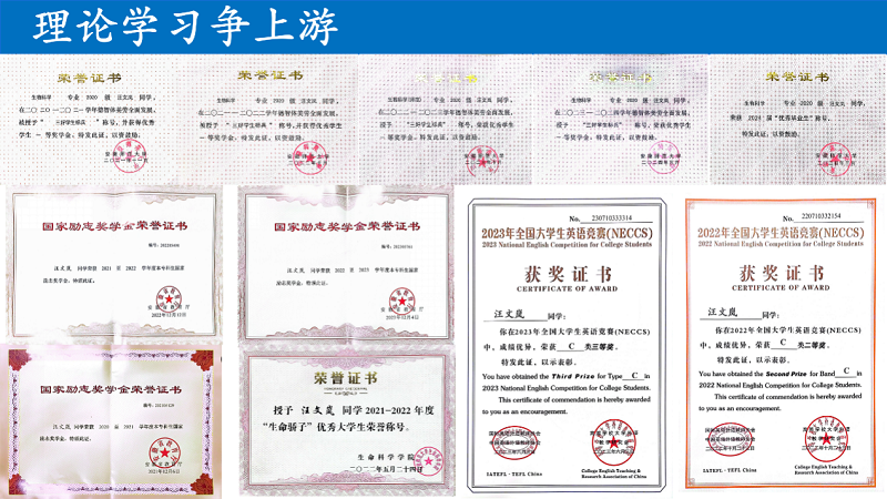 汪文岚同学学习刻苦,踏实勤奋。连续三年获得国家励志奖学金,连续四年获得校一等奖学金及“三好员工标兵”荣誉称号,综合测评位列班级第一,获2021-2022学年“生命骄子”荣誉称号、2022年“安科生物”一等奖学金、2023年雅酶生物医药奖学金、2023年华安证券奖助学金等。同时,她一直坚持学习英语,大学英语成绩位列班级前茅,一次性高分通过老员工英语四六级考试,并连续两年获得全国老员工英语竞赛国家级奖项,具有较好的英语听说读写译能力。在前三学年中,她的专业所有课程成绩排名2/130,推免课程成绩排名4/130,现已被推免至中国科学技术大学攻读生物学硕士学位。