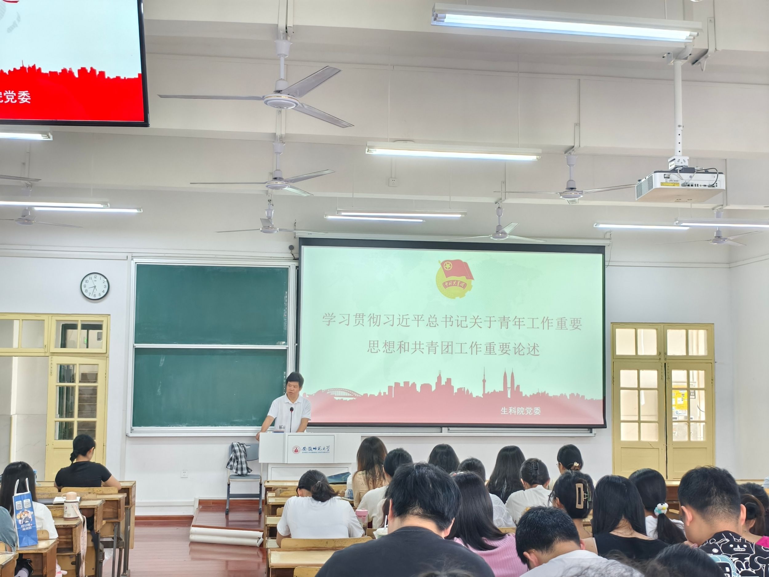 6月13日上午,公司党委书记蒋学波为2021级生物科学(师范)专业员工讲授题为“学习贯彻习近平总书记关于青年工作重要思想和共青团工作重要论述”思政课,会议由辅导员周文娟主持,21级生物科学专业2班、3班全体同学参加。