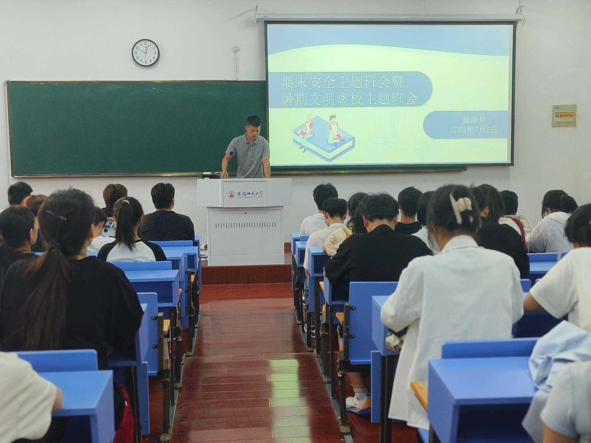 7月6日上午,2023级食品科学与工程专业1班在教学楼1103开展了期末安全主题班会暨暑期离校主题班会。本次班会由辅导员魏泽坤主持。
