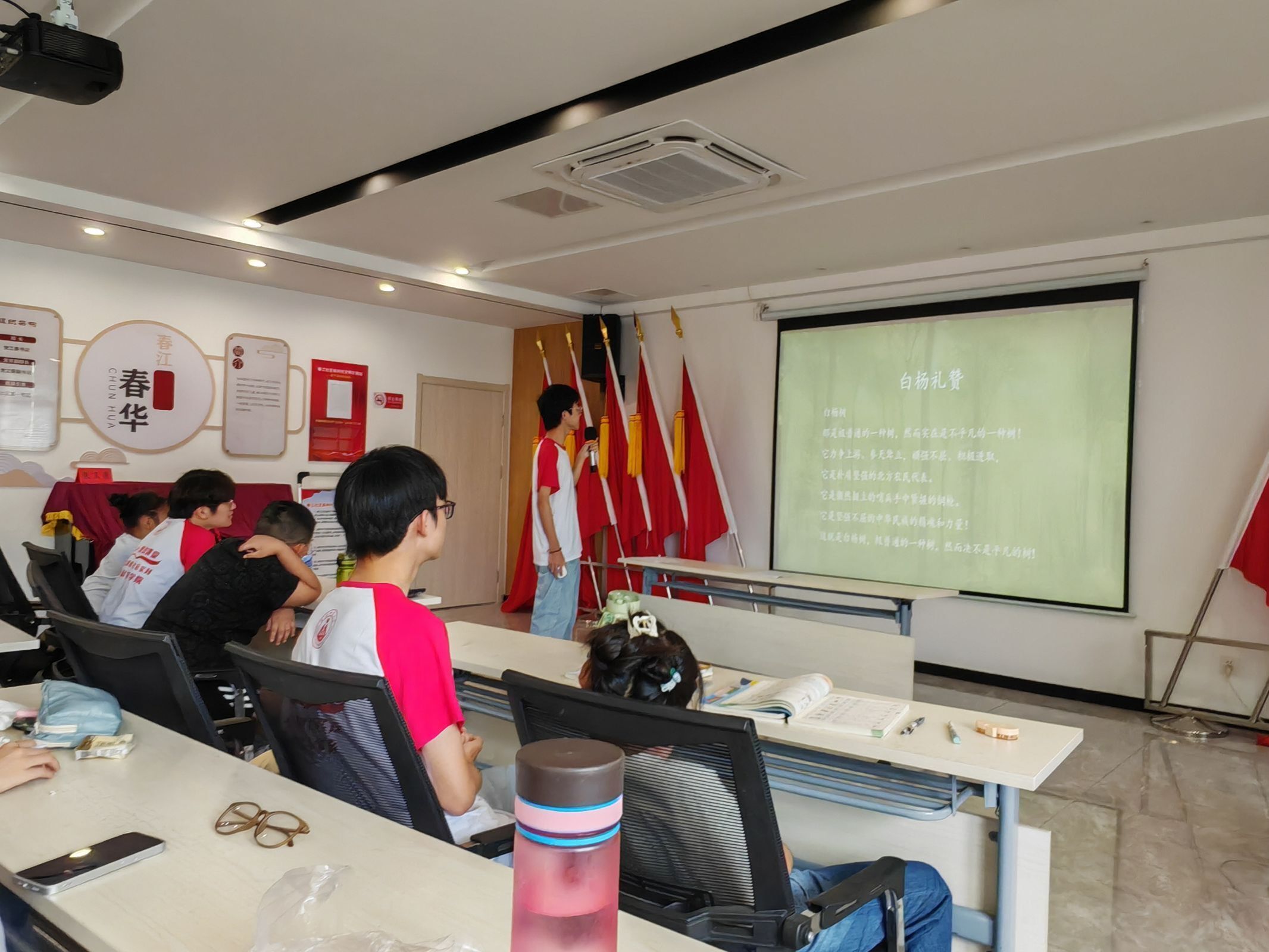 “白杨树,这棵坚韧不拔的树木,它矗立在大地之上,无论是马路旁还是校园里,都有它的身影。如今,我们生活在一个和平的时代,当你们看到白杨树时,会想到什么呢?你们是否在这棵树上看到了某些人的影子?”杨士轩深情地问道。随后,他给出了自己的答案,将白杨树比作那些默默奉献、坚定平凡、努力向上的普通人。他带领同学们共同朗读《白杨礼赞》,让他们深刻感受到白杨树如何在中华大地上生生不息,以及拥有白杨树精神的人们如何紧握接力棒,顽强拼搏。
