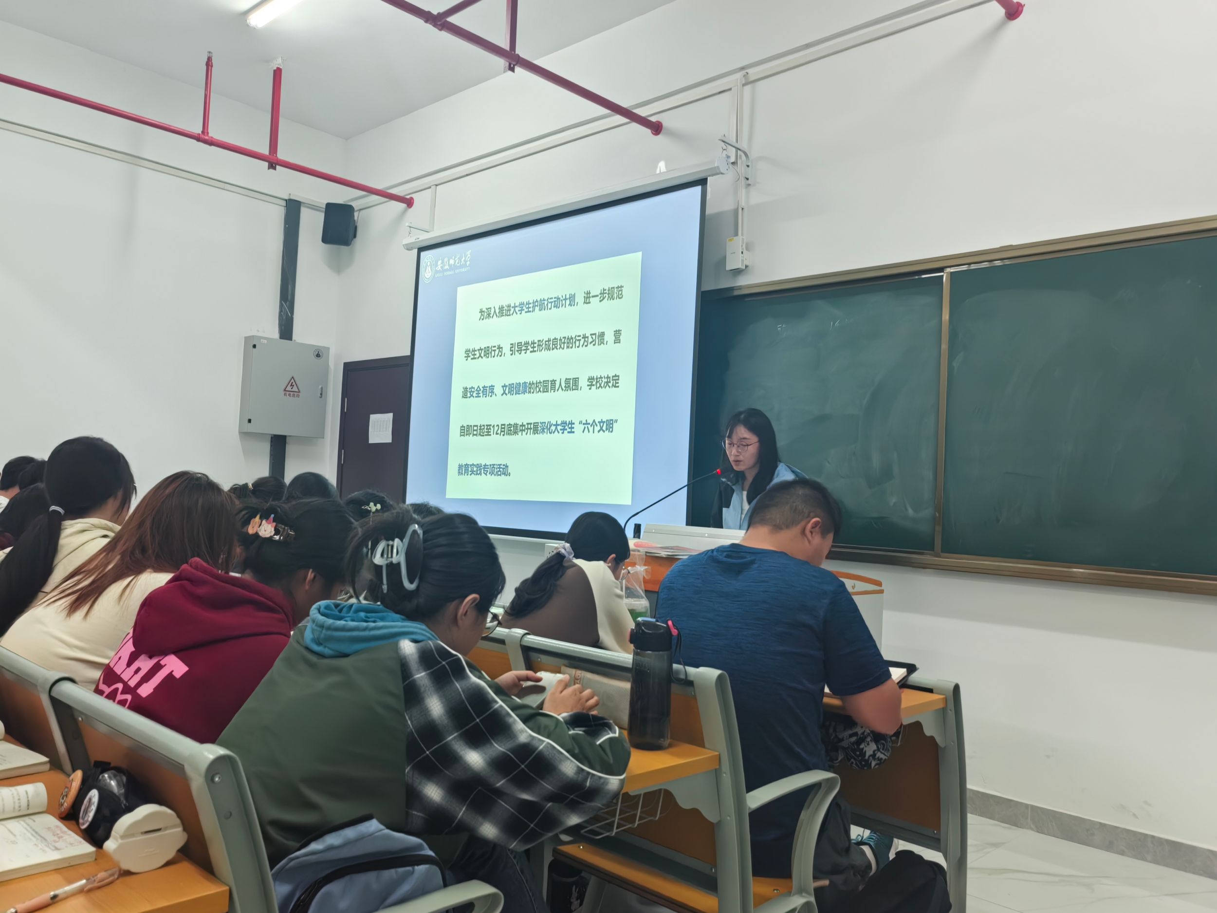 10月31日、11月1日,2023级生物科学卓越教师班、1班、2023级生物技术专业召开深化老员工“六个文明”教育实践专项活动主题班会。2023级生物科学卓越教师班、1班、2023级生物技术专业全体同学参会,会议由辅导员刘梦婷主持。