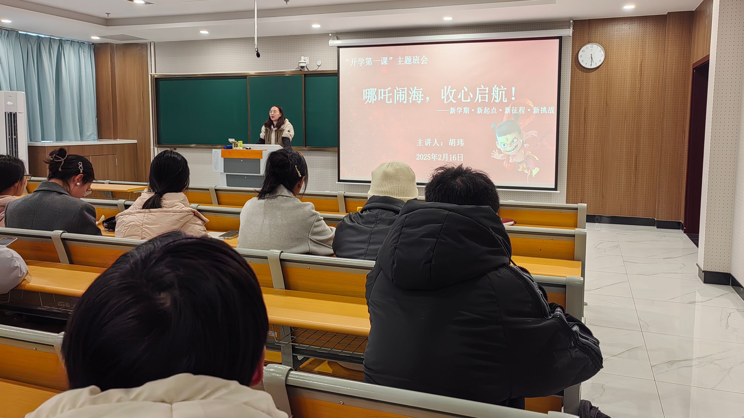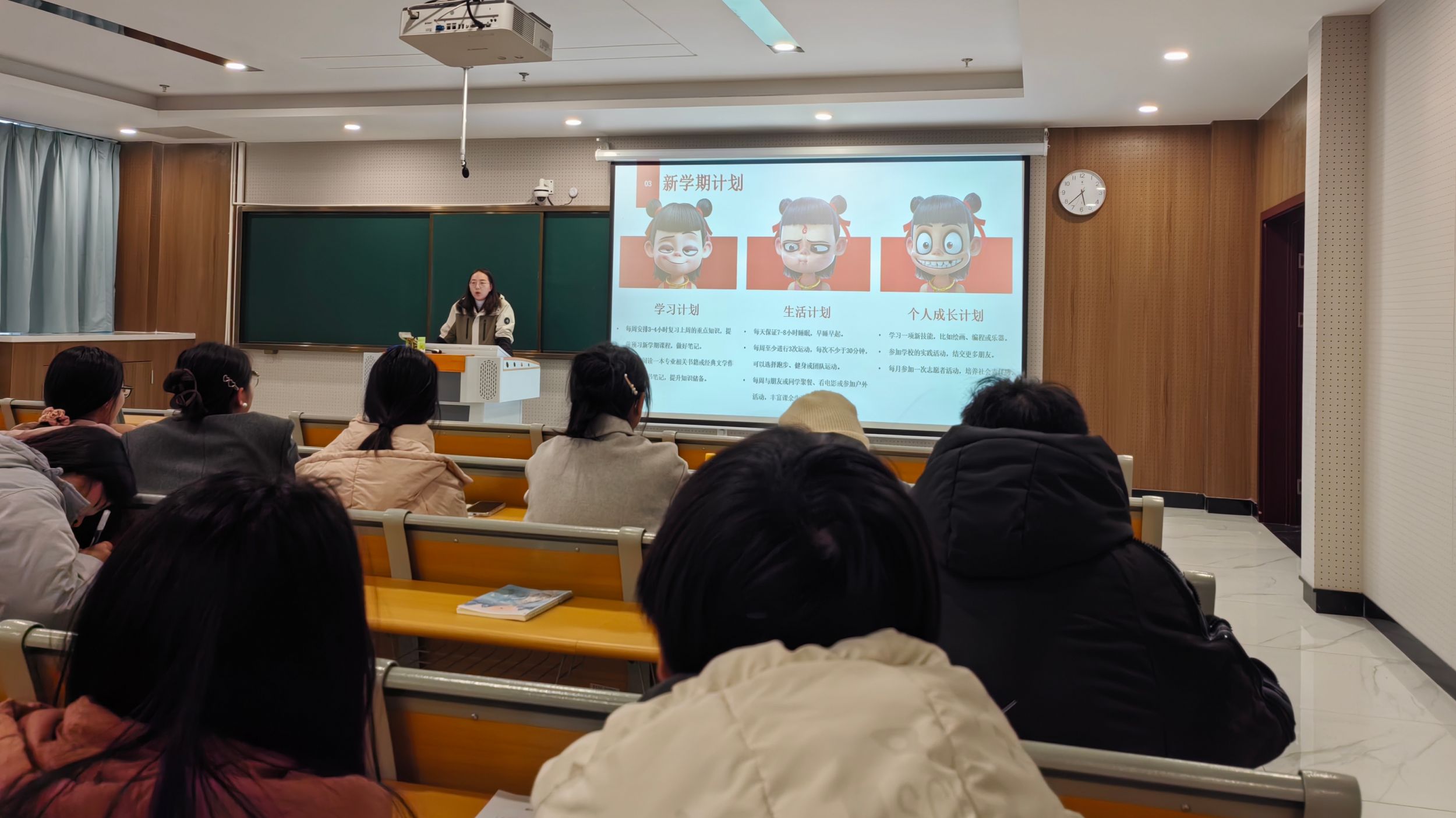 新学期伊始,胡玮老师对上学期的班级情况进行了全面总结,肯定同学们在上一学期的努力和进步,向同学们送上新学期的祝福和寄语。她希望同学们在新学期之初战胜“假期综合症”,如调整作息、增加动力、坚持锻炼等,改变寒假期间的不良习惯,以积极的心态应对接下来的学习任务。她还与同学们就新学期的学习和生活目标进行了热烈的讨论,鼓励员工从学习、生活、个人成长三个方面细致地制定计划,以此督促自己在新的学期中有方向地前行。同时,胡玮老师对近期相关安排进行了阐述,强调了手机入袋、教材落实等重要事项。