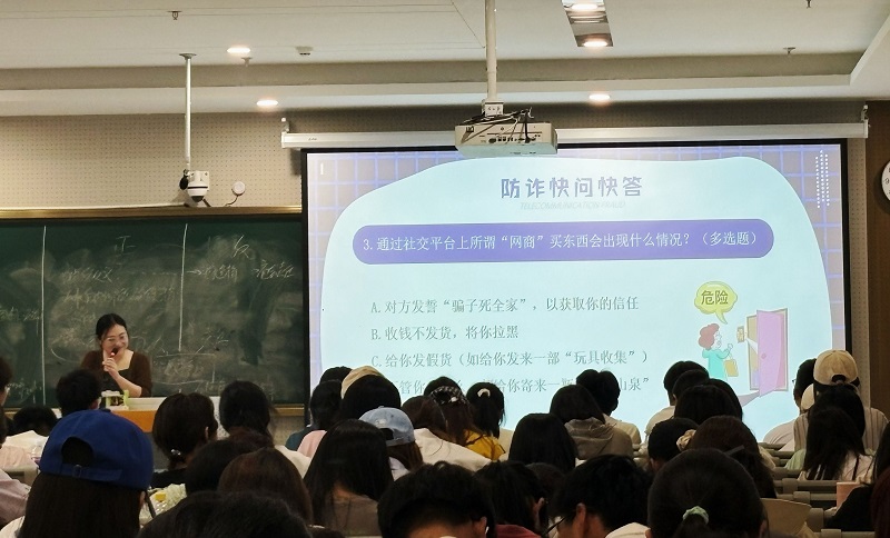 蒋婷婷以真实案例切入,给同学们敲响防诈警钟,她向同学们介绍了常见的诈骗犯罪手法和防范诈骗Tips。在“防诈快问快答”环节,同学们通过多选题深入剖析各种诈骗陷阱。在“口诀传唱”环节,同学们齐声朗读防骗口诀,朗朗上口的句子将反诈要点化为记忆点。本次班会通过互动问答、案例剖析、口诀传唱等形式,为同学们上了一堂生动的“安全必修课”。