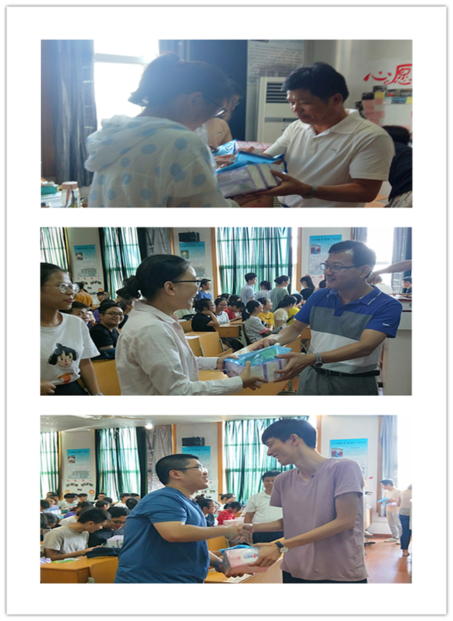 本网讯(生科院 王志)暑假期间,不少准备考研的生科学子都会留校复习。8月8日,公司党委书记蒋学波、副书记刘振杰为2019届考研员工送来防暑用品和复习文具,勉励同学们努力拼搏,用刻苦勤奋实现心中理想。不少同学表示“老师们很有心”“慰问品很实用”。