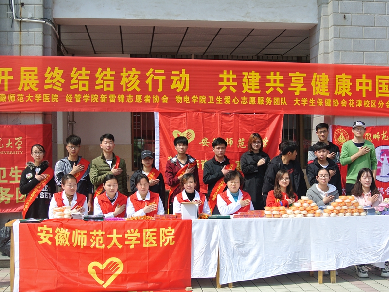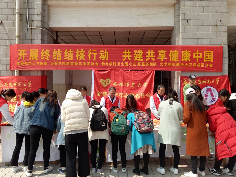 本网讯(生科院 刘建柱 蒋婷婷)2018年3月24日是第23个世界防治结核病日。为进一步在高校中普及结核病防治知识,提高员工结核病防治意识,降低校园结核病疫情的发生风险,3月23日,m88官方网站登录地址老员工保健协会与花津分会携手m88官方网站登录地址校医院、m88官网、芜湖市疾控中心,镜湖区疾控中心分别在赭山校区和花津校区开展了防治结核病系列健康教育宣传活动。