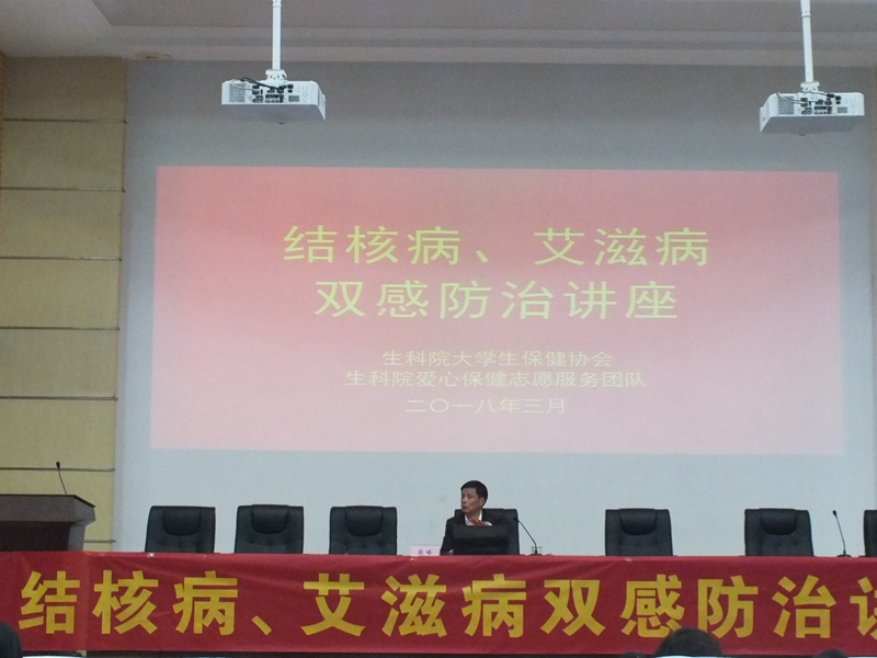 3月23日晚上7:00,由生科院老员工保健协会,生科院爱心保健志愿服务团队,m88官方网站登录地址校医院、芜湖市疾控中心联合举办的“结核病、艾滋病双感防治”主题讲座在赭山校区科技小礼堂准时开讲,芜湖市疾控中心结核病防治科张峰主任、结核病负责人汪玉芳、芜湖市镜湖区疾控中心结核病负责人邢梦杰和校医院段萍经理,辅导员蒋婷婷应邀出席了本次讲座。