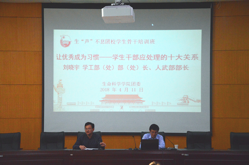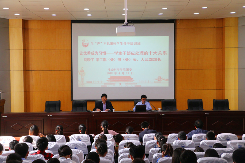 本网讯(生科院 何馗馗) 4月11日,公司生“声”不息团学骨干培训班在田楼报告厅开讲。校学工处处长、学工部部长刘晓宇应邀作题为《让优秀成为习惯——员工干部应处理的十大关系》的辅导报告。公司党委书记蒋学波、副书记刘振杰、院团委书记王志、各年级辅导员、公司团学骨干及新生代表共240余员工一同参加学习。报告会由公司党委书记蒋学波主持。