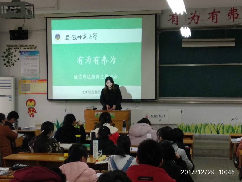 (本网讯 魏婉月)临近期末考试,为强化员工诚信考试意识,2017年12月29日上午生物技术专业在田楼8308教室召开“有为有弗为”诚信考试主题班会,辅导员谷静主持班会。