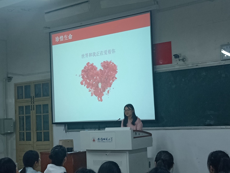 蒋婷婷老师首先以一些有关生命的照片引导同学去认识生命的独特性。她用“夹缝男孩”廖波、带着妈妈上大学的学姐石秀琴等人的故事告诉我们人生并不是一帆风顺的,要积极悦纳自己,勇于面对挫折。最后她给同学们看了朱德庸漫画—我从11楼跳下去和时间格子引导同学们学会感恩,珍惜时间,珍惜生命。
