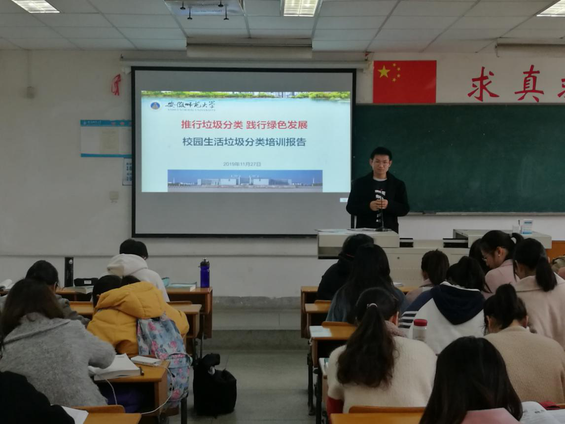 本网讯 (生科院 2017级生物制药)随着绿色环保理念深入人心,人们逐渐意识到环境问题对生活造成的影响,开始推广垃圾分类。11月25日,“垃圾分类”正式走进m88官方网站登录地址,为响应新时代号召,宣传垃圾分类的相关知识,增强班级同学垃圾分类的意识,提高班级同学的环保素质,安徽师大2017级生物制药专业1班在辅导员老师蒋婷婷指导下,开展了以“垃圾分类”为主题的知识宣讲。