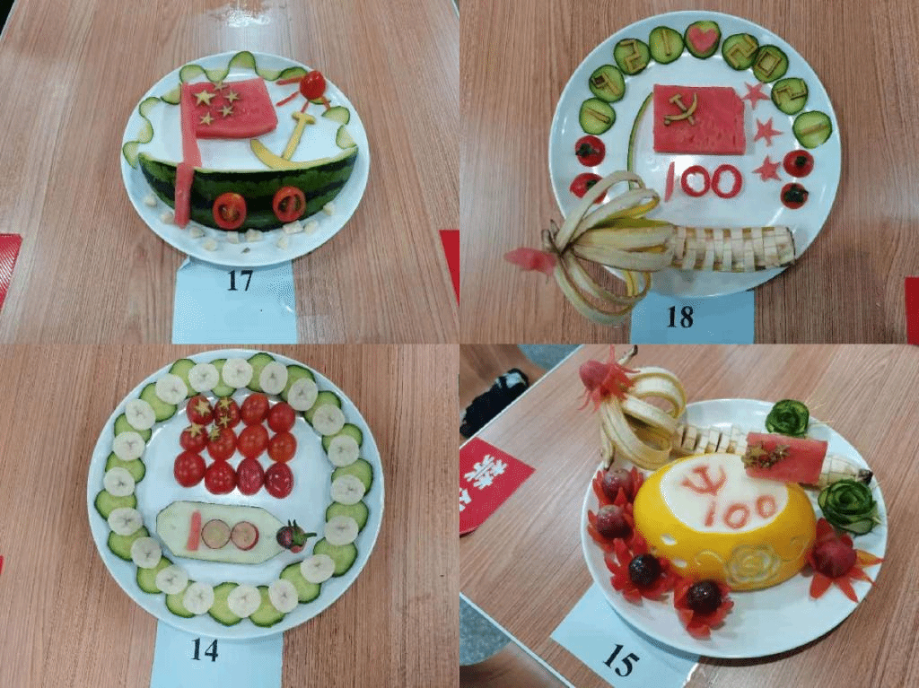 参赛选手们争分夺秒,用给定的各种水果,使用手中的工具将平淡无奇的水果在盘中拼出各种生动形象,意蕴深厚的作品,用实际创造表达了对建党百年的深深祝福。