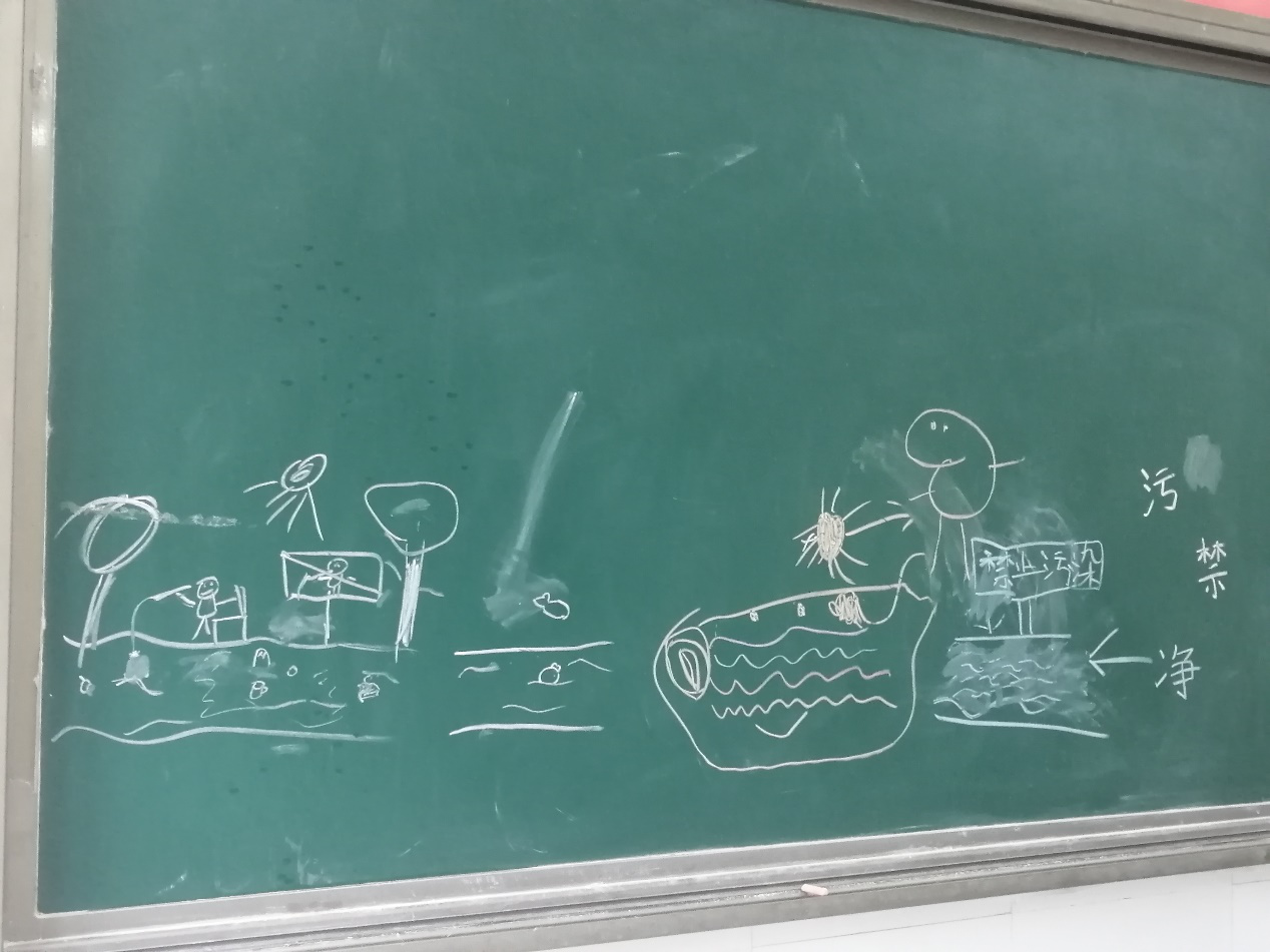 最后志愿者让同学们将自己印象中黑臭水体的形象用绘画的方式表现出来,同学们各自发挥,有的将因水体污染的小鱼画下来,有的在河流旁边安置了一块警示标牌,有的画出黑臭水体旁奄奄一息的树木,都十分的形象生动。