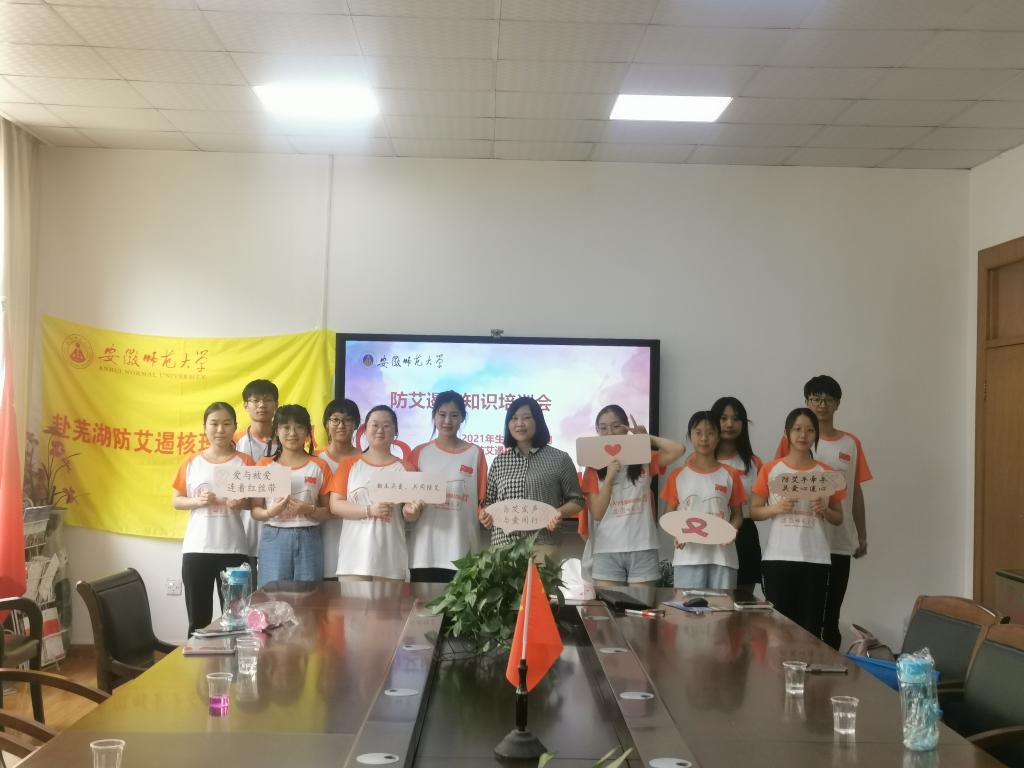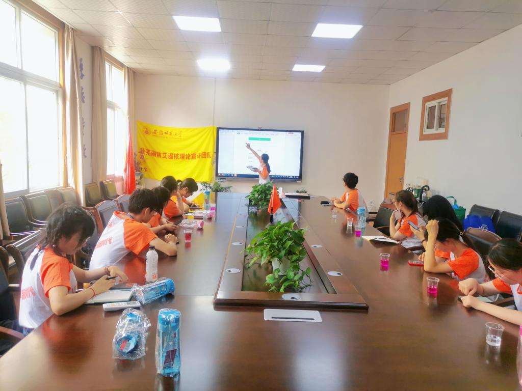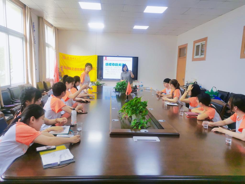 随后,安徽省芜湖市疾控中心科长方艳姣对团队全体成员进行专业的防艾知识培训工作。她就艾滋病的基本理论、传播方式、预防措施、易感人群以及近年来艾滋病的发病率情况进行了详细的阐述。针对艾滋病的性传播、血液传播和母婴传播三种传播途径,她重点提出了禁止性滥交及其他高危性行为、禁止静脉注射吸毒或是食用新型毒品和不使用患有艾滋病母亲的母乳喂养孩子等预防措施。她强调,近年来艾滋病在青年员工中的发病率逐年提高,特别是处于青春期的广大中员工和老员工更要注意对艾滋病的预防,做到知识记心中,防患于未然,因此防艾宣传活动需要进一步在校园中推行。为了巩固知识,她还和全体成员一同进行了一个小游戏,利用碳酸氢钠溶液会使酚酞变红的原理模拟了艾滋病的传播过程,更直观地体现了性滥交的危害,加深了对艾滋病传播途径的理解,加强了对艾滋病的重视程度。