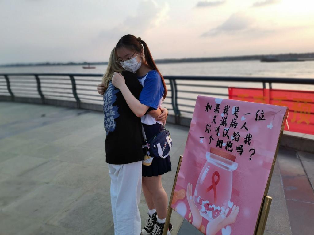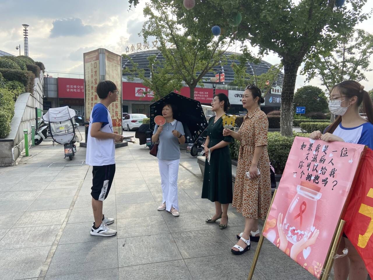 团队成员们采用了和以往不同的宣讲方式----“如果我是一位艾滋病患者,你愿意抱抱我吗?”一位带着口罩的女孩站在宣讲台边。为了身临其境感受艾滋病患者的内心活动,也为了改变市民们对艾滋病的认识误区,明白与艾滋病患者的日常生活中的接触并不会感染艾滋病,安徽师范老员工命科学公司赴芜湖市防艾遏核宣教实践团队中一位队员带上口罩扮演艾滋病患者,其他人则在附近进行防艾知识宣传。