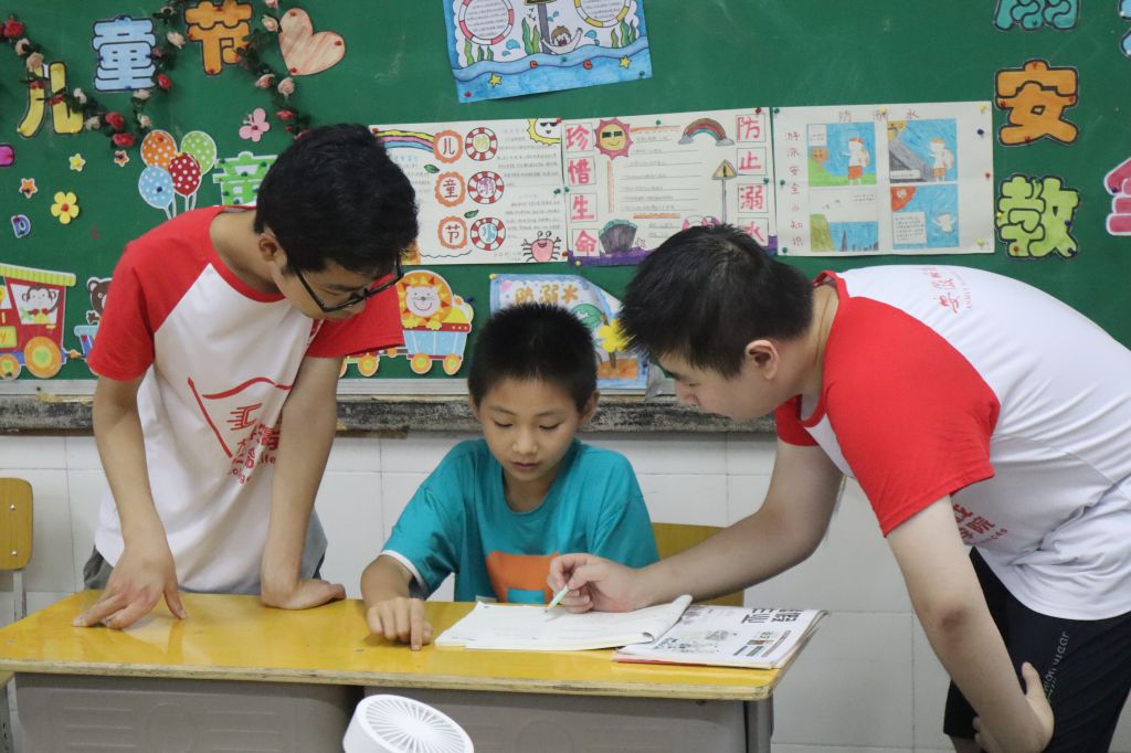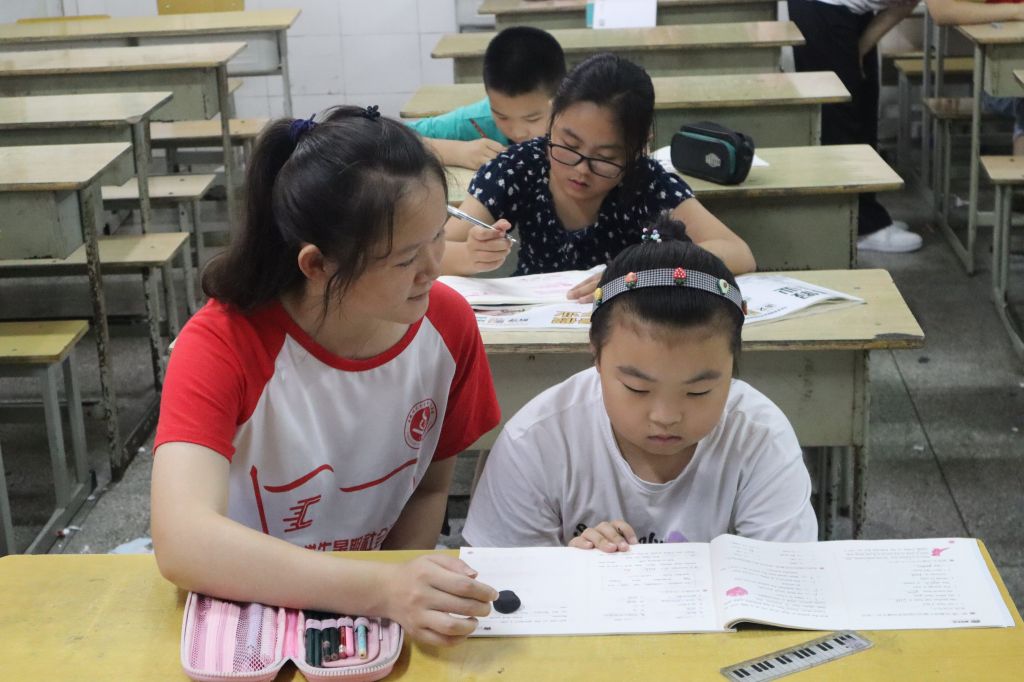 队员根据同学们各自不同的学业情况进行专项辅导,补缺补漏,引导孩子们巩固知识,完成学业目标,现场气氛融洽,活动积极进行,教学相长,双方共同发展。