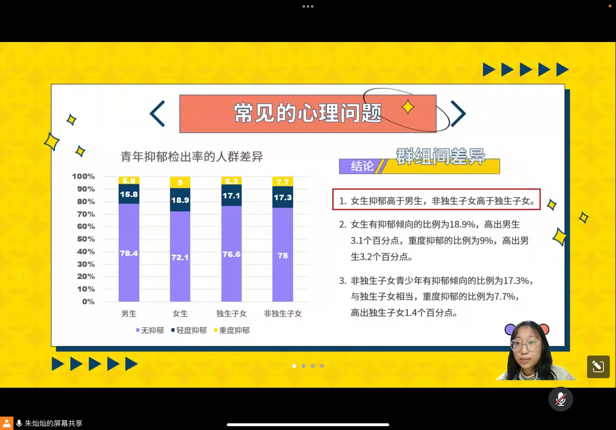 会议分两部分展开,朱灿灿首先从老员工常见的心理问题入手,将班级同学近期的困惑分为考研求学、毕业就业和考公考编三方面,并逐一展开讲解。心理问题在性格上可体现为自私狭隘心理、逆反心理、抑郁心理等,且通过调查显示,女生抑郁高于男生,非独生子女高于独生子女,但同时朱灿灿同学也及时做了解释:该调查结果仅供参考,不能以偏概全。以上心理问题导致的严重后果即是同学们情绪、生理以及行为方面会出现多种不适。随后,朱灿灿同学就心理问题给出了一系列调整方案,她建议同学们在日常生活中学会自觉学习,保持一个良好的平常心,并且降低期望值来避免失望感;多参加活动加强意志锻炼,不盲目与同学竞争。通过以上的改变从我们的生理、认知、行为等方面来进行调节,培育同学们的积极情绪。最后的讨论阶段不少同学提出自己的疑问,会议虽然是线上举行的,但是仍然乐趣满满。