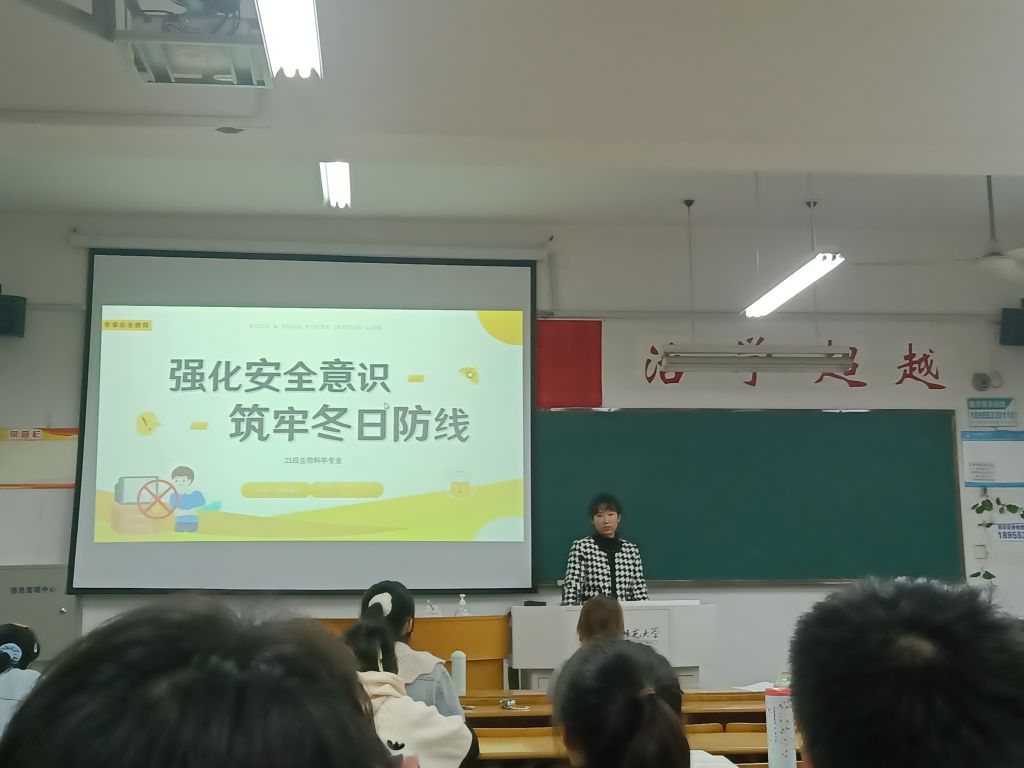 为切实做好冬季公司安全工作,提高员工冬季安全意识,严防各类安全责任事故,确保员工生命财产安全,2022年11月21日晚,21生科1班在田楼8304教室召开“强化安全意识,筑牢冬日防线”安全主题班会。会议由辅导员周文娟主持,生科1班全体同学参加。
