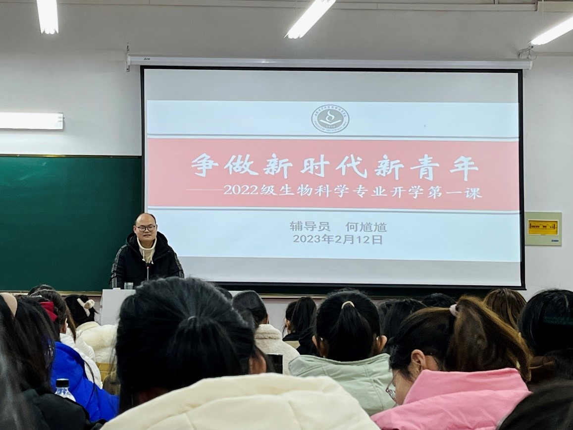 2月12日,m88官网2022级生物科学专业在1403、1409教室依次召开“开学第一课”班会。班会由辅导员何馗馗主讲。2022级生科专业全体同学参加。