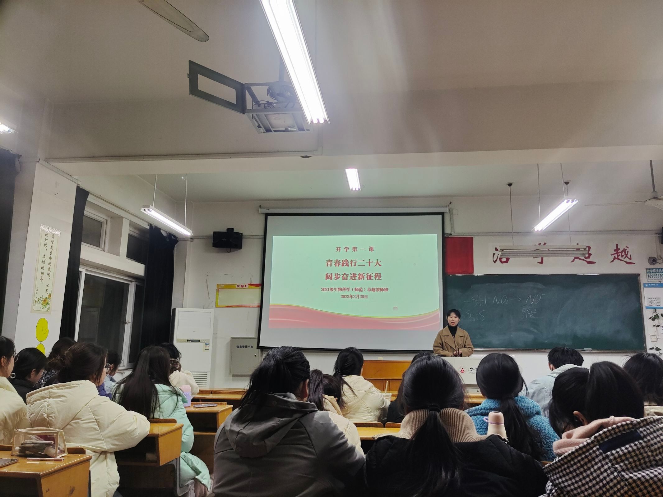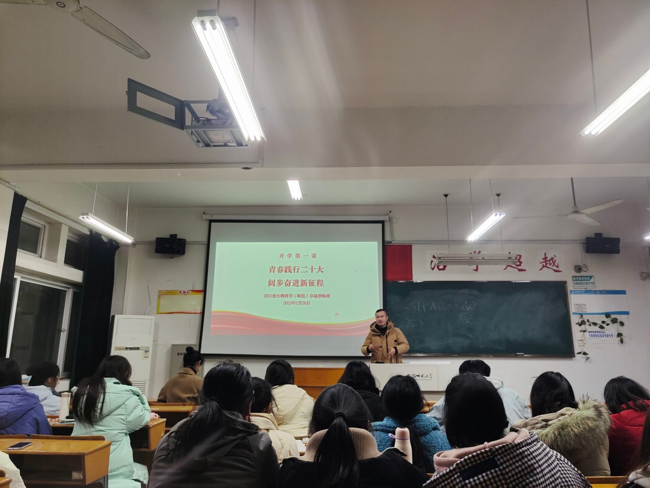 学期伊始,为深入学习贯彻党的二十大精神,点燃新学期奋发动力,226日晚在田楼8304教室,举办了“青春践行二十大,阔步奋进新征程”为主题的“开学第一课”班会。主持本次班会的是辅导员周文娟。21级生物科学卓越教师班全体同学与专业负责人姜斌、班主任张亚参加本次班会。