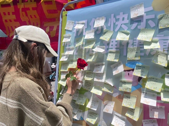 为响应公司本次“沐浴阳光,青春绽放”专项主题心理健康主题活动,5月25日当天赭山校区开展以“祝你快乐”为主题的站台活动。活动分为两个部分,一是结合公司专业特色,展示员工手工环保作品;二是号召大家结合“祝你快乐”主题进行现场短诗创作和展示。参与活动的同学可以领取鲜花一朵。