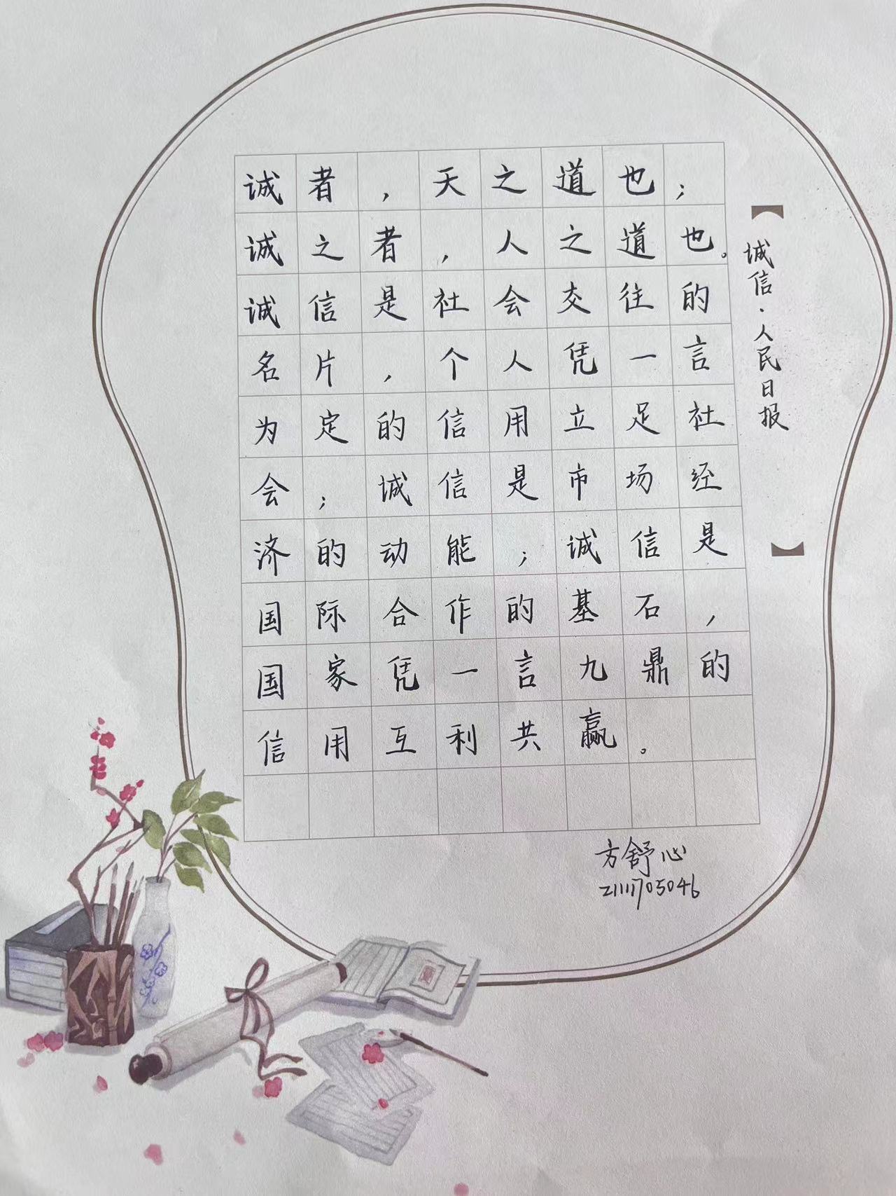 公司积极动员和宣传诚信主题作品创作活动,收集到文稿、书法、绘画、微视频等作品多份,通过诚信相关名人名言的书法摘抄、诚信主题文稿的撰写、诚信微视频作品的创作,使员工通过多种形式领会到诚信的重要性,提高了员工的诚信价值观。