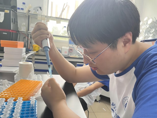 “你们看,移液枪的正确握法是这样的......”团队成员在相关人员的指导下学习使用各种仪器,随即展开对叶片DNA的提取工作。“你们既然留下来了,那我希望你们把这个暑期实践做好。”辅导员对参加实践活动的成员们说道,而团队成员也没有辜负辅导员的期望。称量、研磨、离心、滴加各种试剂,所进行的每一步操作,团队成员都十分认真,不敢有一丝马虎。经过两天的实验,至7月9号,DNA的提取工作已全部完成。