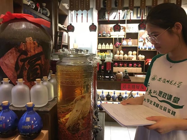 实践成员们于队长童鑫的带领下,分为两个小组,分别前往仁和楼,西门两个入口,以口头询问或者纸质问卷的形式进行调研。并进入部分卖酒店铺了解酒的品种,询问菊花酒的有无及其售卖等情况。调查结果显示,老年人群对贡菊以及贡菊米酒有很大的兴趣,中年群体一半以上表示不想了解,青年群体表示对此有很大兴趣。