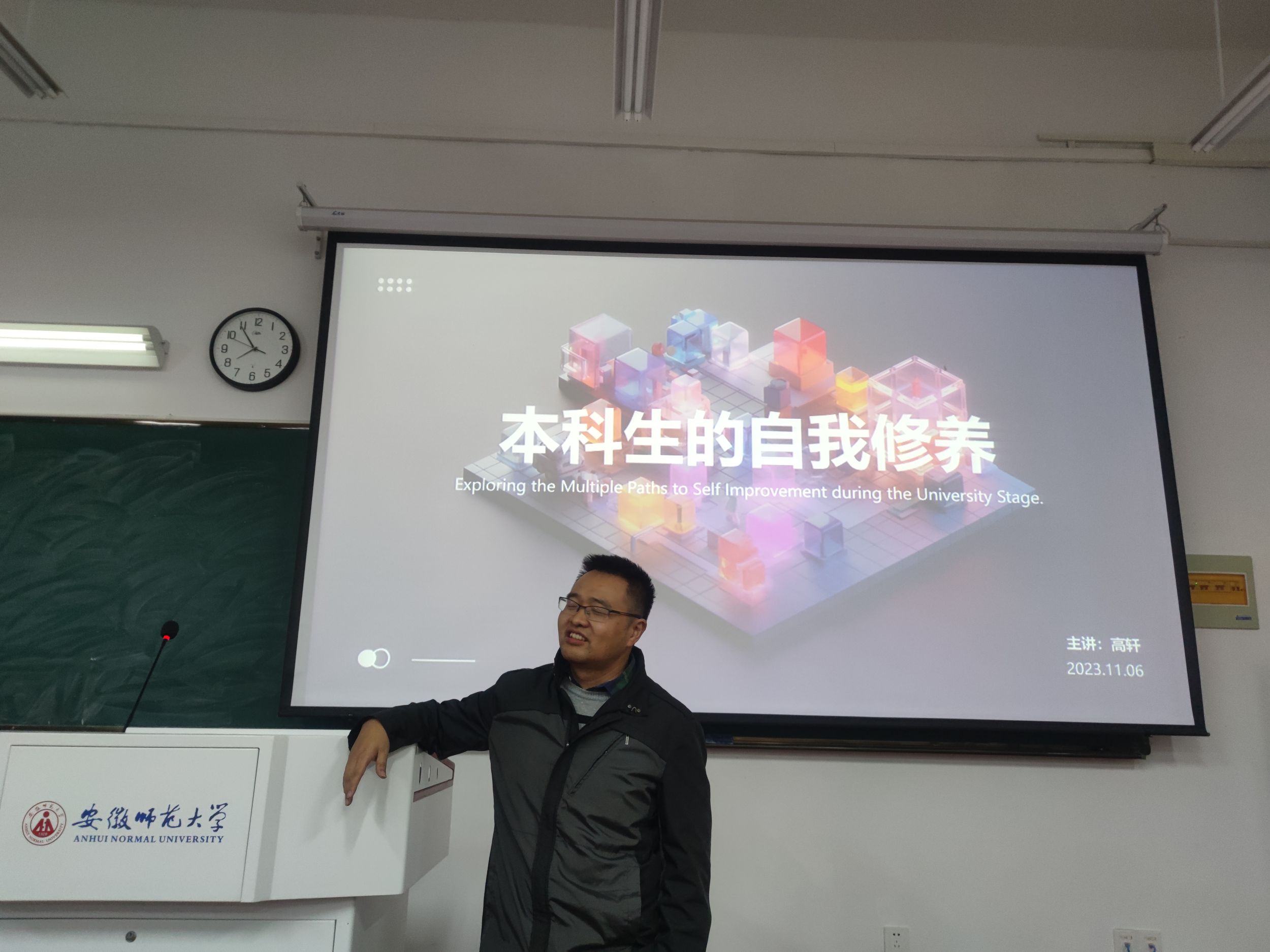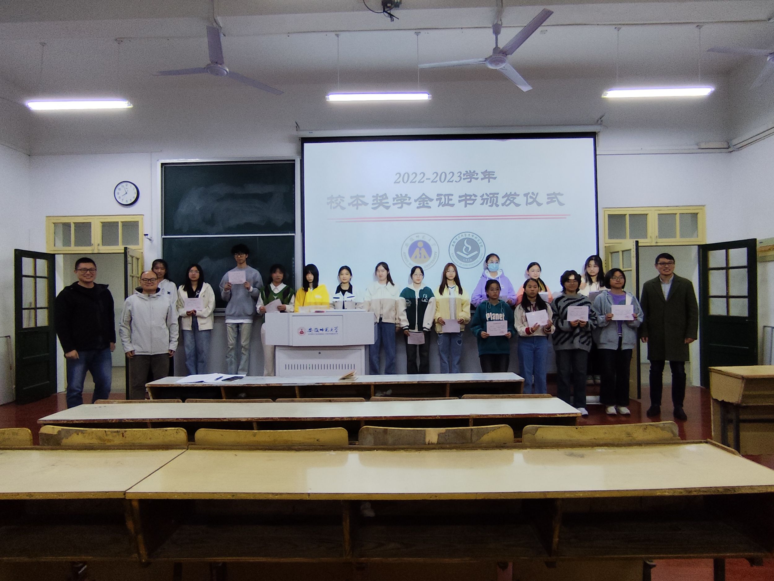 班会中,何馗馗就秋季同学们在学习、生活和遵守纪律方面遇到的共性问题进行了梳理、并分析了成因和给出解决路劲。他还带领同学们学习了“两弹一星”精神、载人航天精神。他要求同学们进一步明确目标、砥砺奋斗,深入学习贯彻“两弹一星”与载人航天精神,践行“六个文明”,做奋发有为“师大人”。班会上,班主任为2022-2023学年校本奖学金获得同学颁发了荣誉证书。