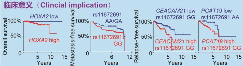 在临床方面,研究人员发现HOXA2和CEACAM21可独立作为潜在的预后分子标志物,HOXA2表达水平可用于区分可能在中度风险前列腺癌组(Gleason评分7)中复发的患者,CEACAM21较高表达水平的患者组具有增加生化复发的风险等。更有意思的是,根据rs11672691的基因型可以直接预测前列腺癌病人的预后情况,rs11672691基因型和PCAT19或CEACAM21基因表达对前列腺癌预后有着显著协同作用(下图)。综合这些结果为rs11672691与侵袭性前列腺癌相关提供了合理的机制解释,因此奠定了可能将这一发现转化为临床的基础。
