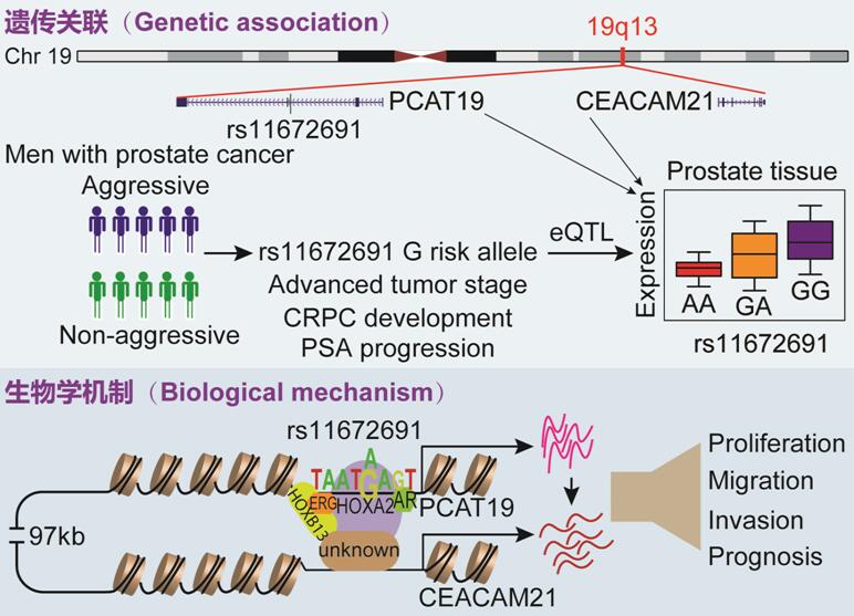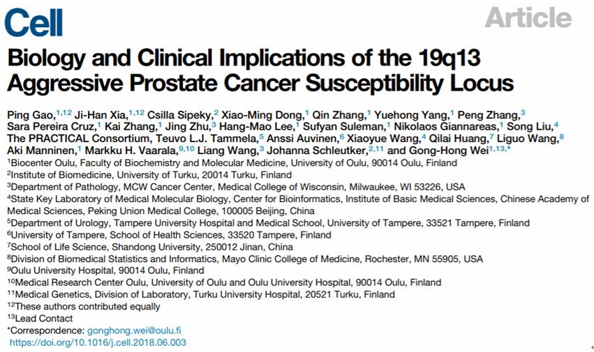 据报道,亚洲男性前列腺癌的发病率远低于非洲裔美国人和欧洲白种人,表明遗传背景是该病因和发展的一个重要风险因素。随着全基因组关联研究(GWAS)的推广,近十几年来,我们对前列腺癌遗传易感性的理解有了很大的发展,迄今为止已经发现了超过150个与前列腺癌风险相关的单核苷酸多态性(SNP)位点,其中部分位点的生物学效应和致病机制也有了深入的阐述。相比之下,我们对于侵袭性前列腺癌的遗传风险因素了解甚少,目前GWAS仅确定几个侵袭性前列腺癌易感位点,包括19q13位点的rs11672691。最近的GWAS荟萃分析报道,位于长链非编码RNA(lncRNA)PCAT19(前列腺癌相关转录物19)第二内含子内的rs11672691不仅与前列腺癌易感性有关,而且与其侵袭性显著相关。有趣的是,在另一项大型队列(10487例患者,随访时间平均8.3年)研究中,观察到rs11672691与前列腺癌死亡风险增加相关联。2018年7月26日,Cell杂志发表了公司2000届员工,芬兰奥卢大学卫功宏教授团队的研究论文,深入阐释侵袭性前列腺癌风险位点19q13的分子遗传和生物学机制,以及该发现的潜在临床应用。