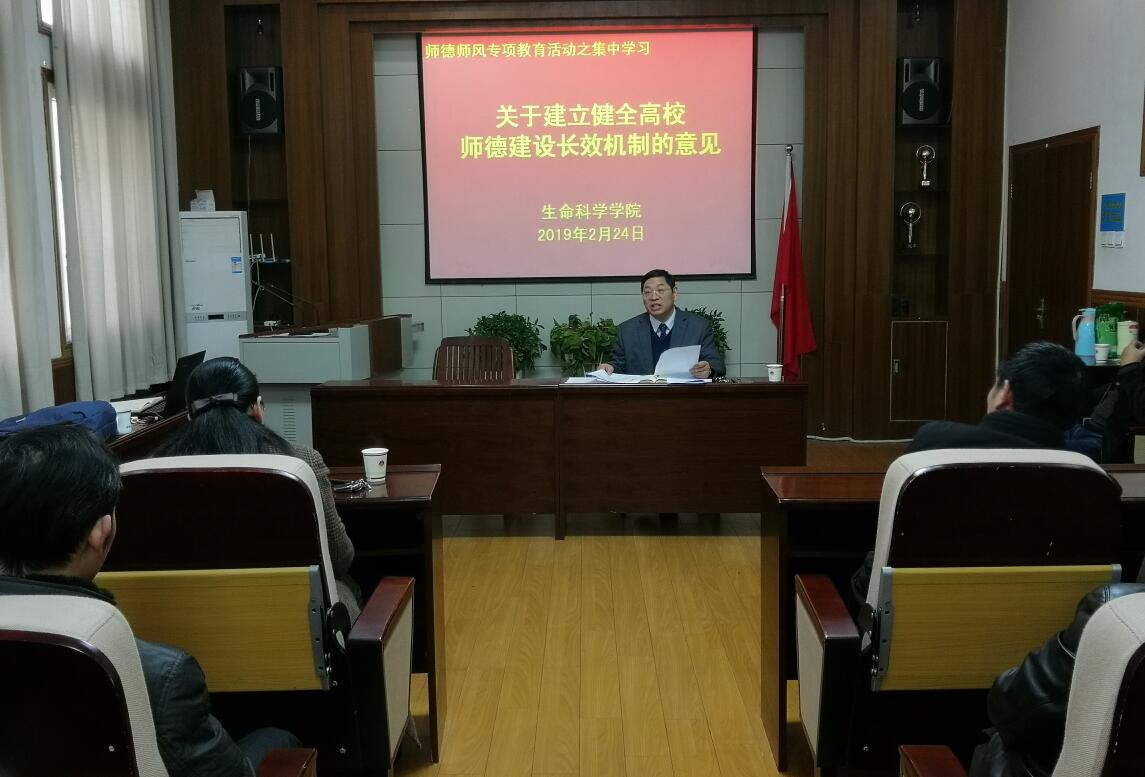 吴孝兵解读了《关于开展教职工师德师风专项教育活动的通知》(师发〔2019〕7号),带领与会教师集中学习了教育部《关于建立健全高校师德建设长效机制的意见》文件精神。