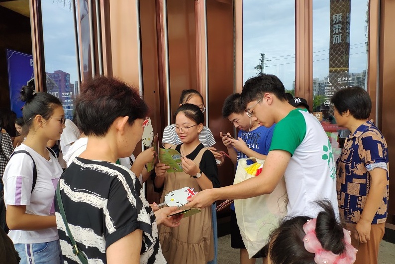 宣教活动开展之前,团队队员了解到银泰城位于弋江区,周边繁华商业街、城南大学城、高档小区环伺而立,人潮密集,是一个适合进行宣教的地点。早上9点,在队长凡定刚的带领下,队员们满怀信心的来到银泰城。虽然离商场营业还有一个小时左右的时间,但商场门外已经聚集了一群市民。不知道是不是因为队员们身上的青春明亮的队服,市民们向我们投来了好奇的目光。"您好,我们是安徽师范老员工科院赴芜湖防艾遏核宣教实践团队,开展暑期三下乡防艾宣教活动,进行防艾健康知识宣讲,防艾你我并肩作战,有爱彼此共享蓝天……" 队员们一边宣讲,一边向大家发放宣传册。"原来你们是在宣传防艾知识啊,你们这样的老员工开展公益性的活动,很有意义,我们理应支持! "一位阿姨听完宣讲后感叹道。大家的支持是团队队员继续宣传的重要动力! 在队员们一遍遍的宣传中,在市民们一声声的赞许中,很快就到了银泰城开业的时间。