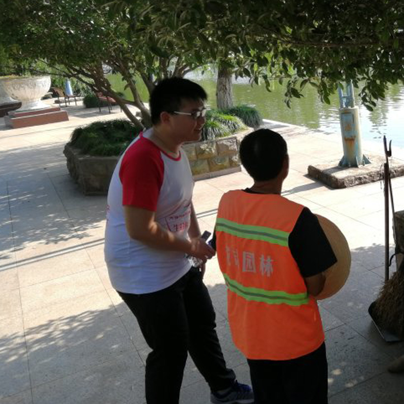队员在预先考察的基础上,依次来到镜湖、西洋湖进行采样调研,对镜湖、西洋湖周边环境及水体基本状态进行观察和记录。通过与公园工作人员访谈,深入了解环保部门对于水体污染的治理政策及措施,并了解了居民对于环境污染的看法。队员们采访了周边居民,了解他们对于环境保护的认识和日常做法。实践过程中,队员们采访了公园区内的环卫工人,了解景区垃圾处理情况。