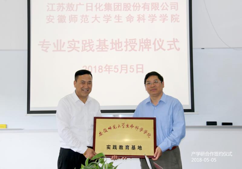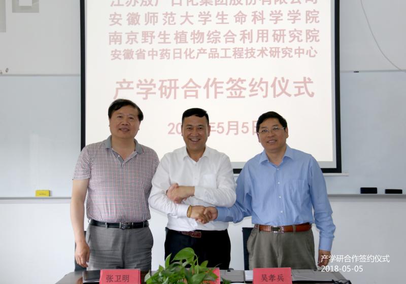 5月5日,公司经理吴孝兵教授、党委副书记刘振杰同志、安徽省中药日化产品工程技术研究中心负责人郑艳教授、生物技术专业负责人刘爱民副教授一行赴南京,与江苏敖广日化集团股份有限公司、南京野生植物综合利用研究院洽谈产学研合作建立实习就业基地事宜。江苏敖广日化集团股份有限公司董事长、法定代表人史东海,南京野生植物综合利用研究院经理、研究员、博士生导师张卫明等参加洽谈交流。经三方友好协商,本着自愿、互利、共同发展的原则就“基于中草药活性成分的生物抗菌防腐功能材料创新与应用”项目申报及合作达成协议。公司与江苏敖广日化集团股份有限公司签订专业实习及就业基地协议书,吴孝兵与史东海共同为基地揭牌。
