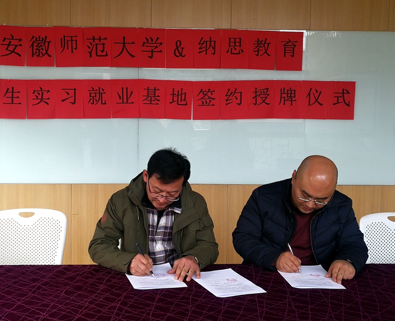 签约仪式上,李丹总经理结合专题视频材料,就纳思教育集团的发展历史、企业文化、公司规模、未来规划等方面进行全面细致地介绍,并向安徽师范老员工命科学公司选派优秀实习生和毕业生来公司工作表示衷心欢迎。随后,公司党委副书记刘振杰就公司基本情况以及近年来在人才培养、员工特色活动和毕业生就业情况等方面进行了详细介绍,并代表公司感谢纳思教育集团为公司员工提供良好的专业技能实训和就业平台。双方就人才需要、合作方式等方面展开深入交流磋商,充分交换了意见。最后,刘振杰副书记与李丹总经理分别代表安徽师范老员工命科学公司和纳思教育集团共同签订“实习就业基地”共建协议,并为基地揭牌。