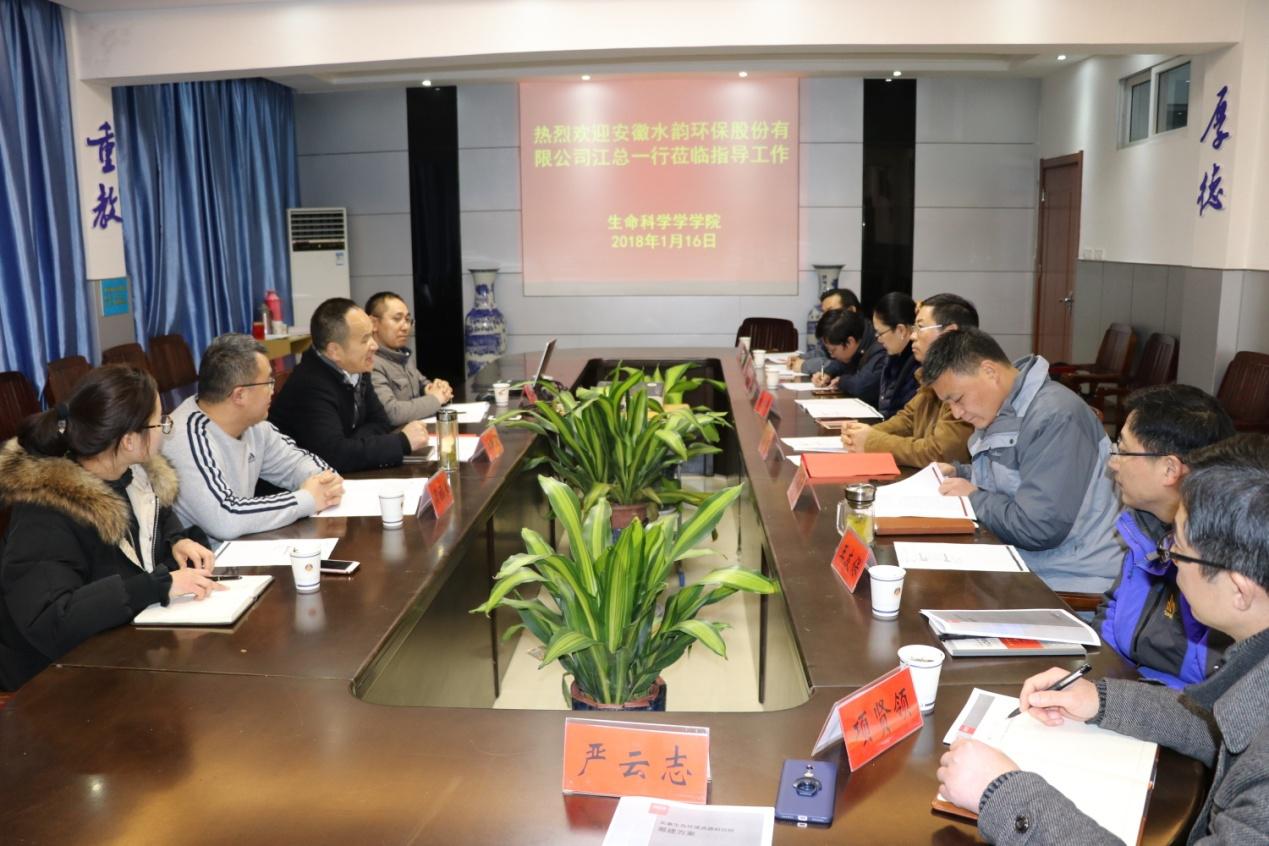 为深化校企合作,充分发挥高校和区域优势企业在各领域的优势,切实转化科研成果,服务地方经济,2018年1月16日,安徽水韵环保股份有限公司应邀来公司探讨共建联合实验室事宜。安徽水韵环保股份有限公司董事长江跃进、总工程师周福来和总经理王明财等一行莅临m88官网,就安徽生态环境资源研究院(筹)的筹建与公司领导和老师进行了充分的交流。m88官网经理吴孝兵、副经理朱国萍、副经理胡好远、以及王友保、邵剑文、陈明林、项贤领和温新利等老师参加了研讨。