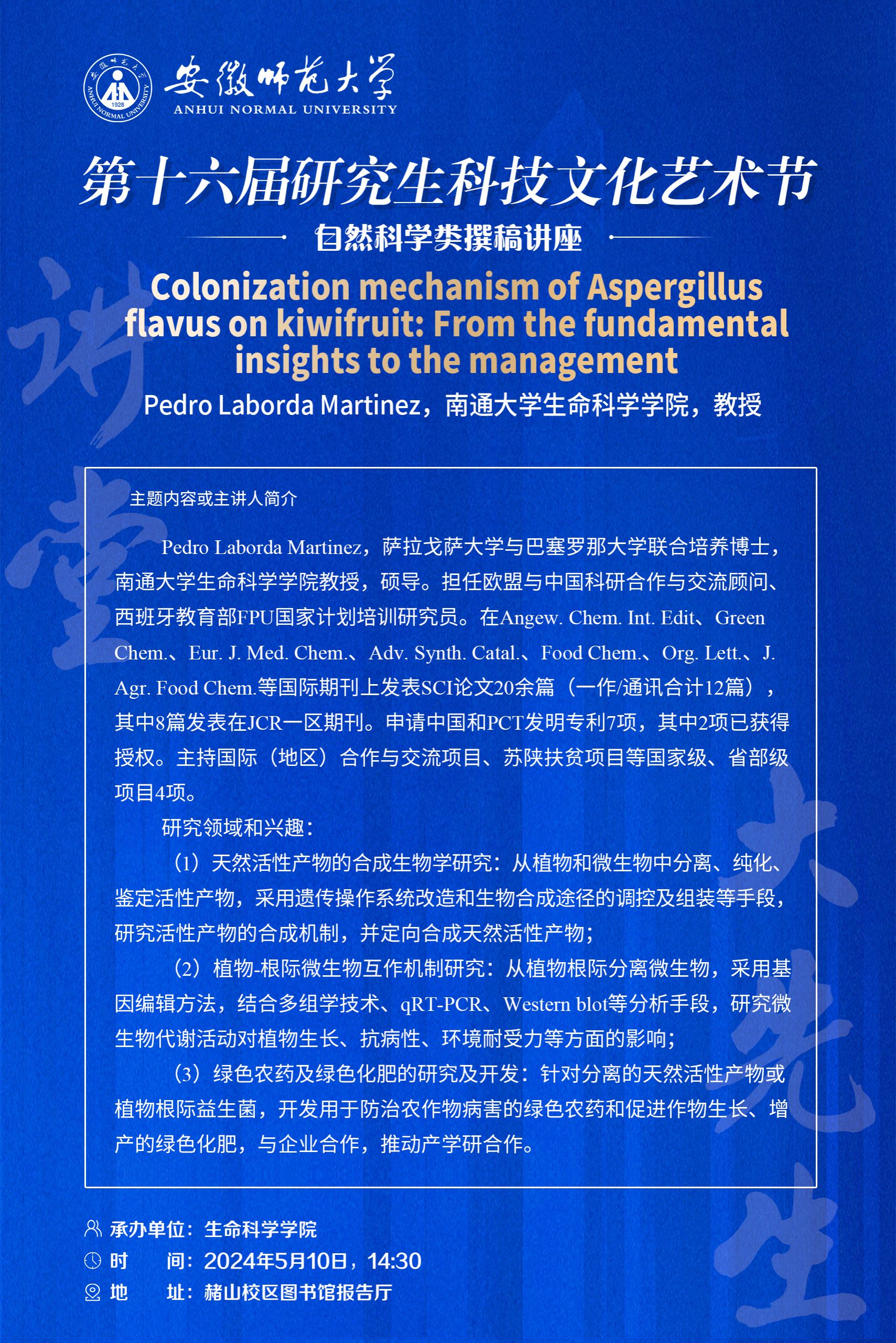 为丰富研究生科研生活,开拓科研视野,激发学术思考。5月10日下午,m88官网邀请南通老员工命科学公司教授Pedro Laborda Martinez在赭山校区图书馆报告厅做了《黄曲霉菌在猕猴桃上的定殖机制:从基础见解到管理》的学术报告。本次报告会由朱先灿老师主持,m88官网师生参加。