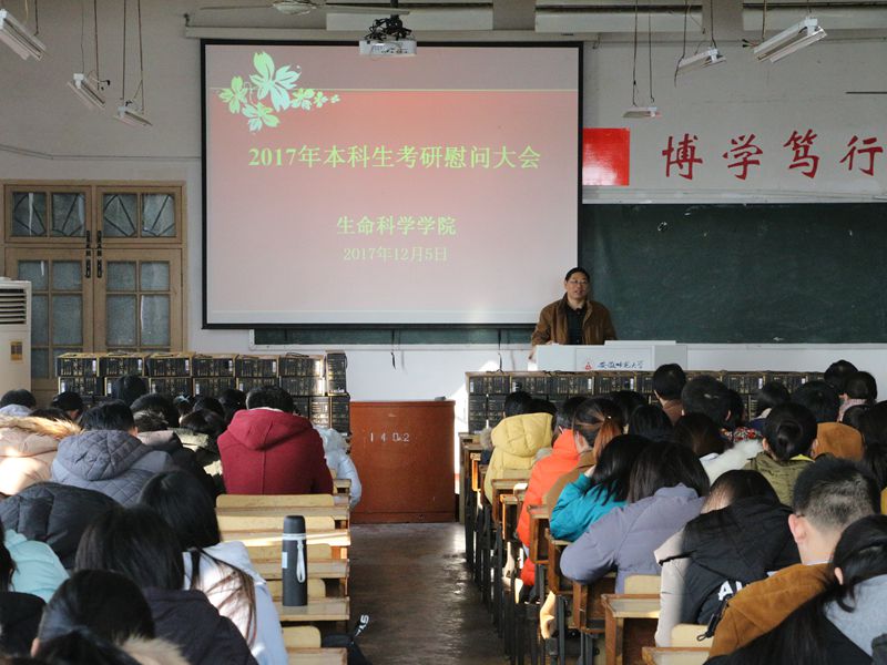 本网讯(生科院 蒋婷婷 赵喆)12月5日下午,m88官网在教学楼1409教室召开了2018届毕业生考研慰问大会。经理吴孝兵、党委书记蒋学波、党委副书记刘振杰、毕业班辅导员赵喆、张磊以及2018届考研学子200余人参加了此次大会。会议由刘振杰主持。