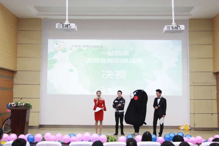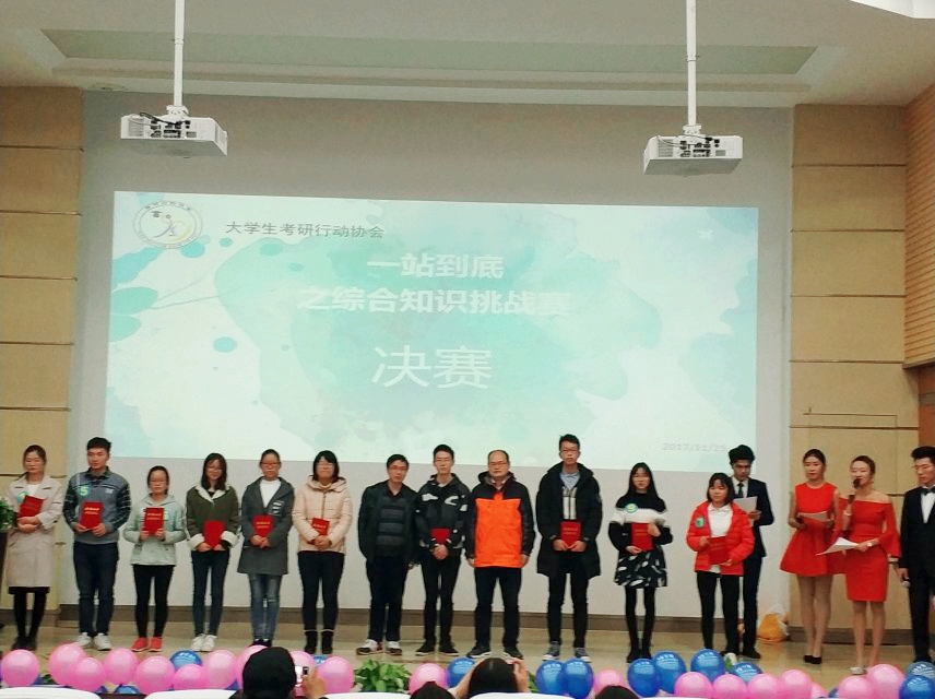 活动开始前,通过大屏幕循环播放由公司党政领导、任课教师、辅导员参与录制的视频,考协给参赛选手加油鼓劲、给考研学子送去慰问鼓励。一段热辣开场舞,点燃现场气氛,拉开决赛帷幕。决赛赛制先通过两两对决,胜利者直接进入下一轮;通过复活赛,被淘汰的5名选手可以有1名选手晋级到终极对决;终极对决中6名选手依次展开两两对决,直至“站神”产生。中场休息环节中,主持人读取“微信墙”上观众的殷切祝愿,并邀请现场观众参与小游戏展开互动、活跃气氛。经过几番较量,2016级生物制药专业卢燕飞同学夺得桂冠、取得“战神”称号。指导教师刘再群老师对整场活动进行了点评。他指出,参赛选手充分展示了自己丰富全面的知识储备,活动组织井然有序、点赞协会骨干。并借此机会,向正在参与观众送去祝福、向正在准备2018年考研的学子送去鼓励。