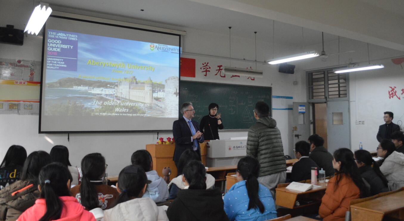 John副董事长随后走进了田楼8309教室,他向同学们介绍了亚伯大学的历史沿革及发展现状,亚伯大学(英文:Aberystwyth University)始健于1872年,是威尔士第一所正规大学,威尔士大学创始公司之一,著名的研究型大学;公司位于度假胜地阿伯里斯特威斯依山傍海建立,员工同时可独享全英第二的威尔士国家图书馆,是绝佳的学习胜地。John董事长与员工亲密交谈,对公司员工表现出来的兴趣、热情和良好的沟通能力表示赞赏,表示热烈欢迎首批员工前去留学深造,将在美丽的亚伯大学等待大家的到来。