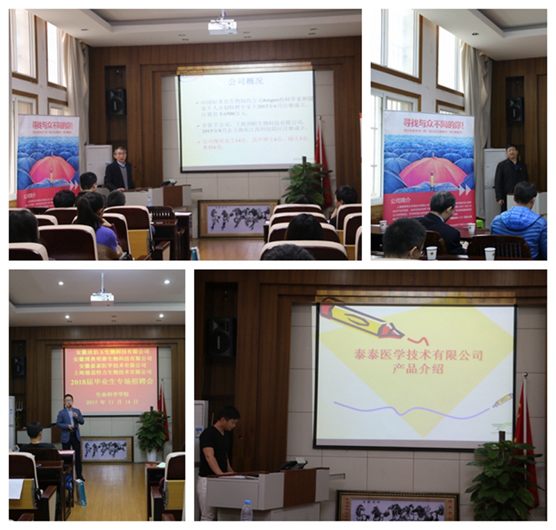 本网讯(生科院 曹莎莎 赵喆)抓住机遇谋发展,专业对口促就业。11月14日,太和县经济开发区管委会组团安徽博奥明赛生物科技有限公司、安徽欣伯玉生物科技有限公司等等5家企业,上海德思特力生物技术有限公司,齐聚公司共同举办专场招聘会。院领导蒋学波、吴孝兵、刘振杰,毕业生辅导员夏齐平、赵喆、张磊及2018届本硕毕业生参加了招聘会。招聘会由蒋学波主持。
