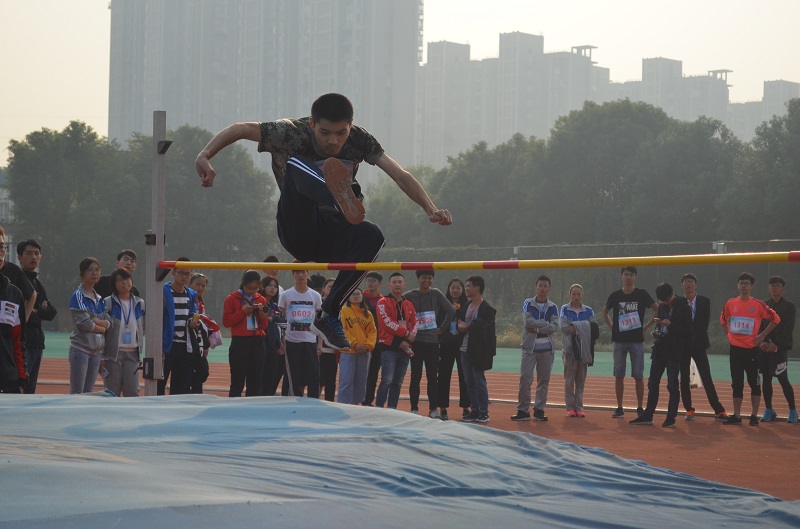 生物技术专业2017级仇志锌同学在男子跳高比赛中奋力一跃,表现优异。